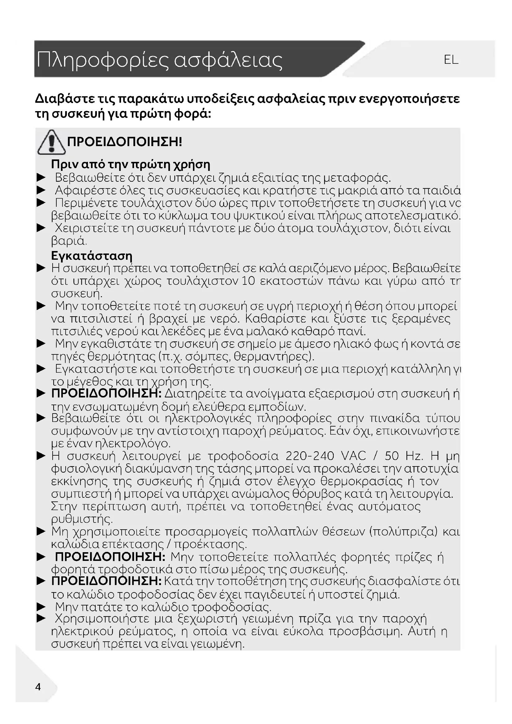 Πληροφορίες ασ φάλειας Διαβάστε τις παρακάτω υποδείξεις ασφαλείας πριν ενεργοποιήσετε τη συσκευή για πρώτη φορά: ΠΡΟΕΙΔΟΠΟΙΗΣΗ! Πριν από την πρώτη χρήση ► Βεβαιωθείτε ότι δεν υπάρχει ζημιά εξαιτίας της μεταφοράς. ► Αφαιρέστε όλες τις συσκευασίες και κρατήστε τις μακριά από τα παιδιά. ► Περιμένετε τουλάχιστον δύο ώρες πριν τοποθετήσετε τη συσκευή για να βεβαιωθείτε ότι το κύκλωμα του ψυκτικού είναι πλήρως αποτελεσματικό. ► Χειριστείτε τη συσκευή πάντοτε με δύο άτομα τουλάχιστον, διότι είναι