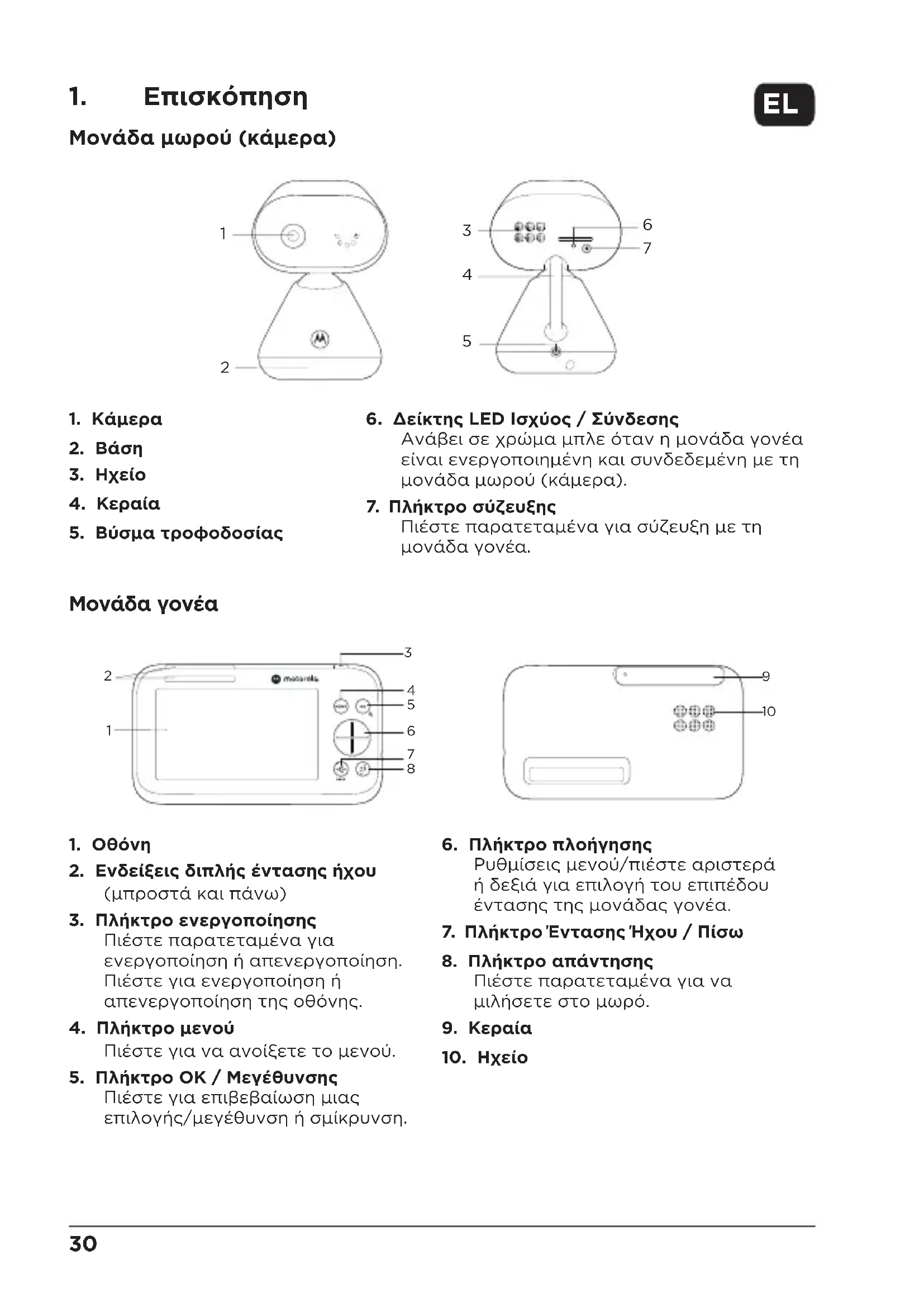 αναβοσβήνει σε κόκκινο χρώμα εάν η μονάδα γονέα δεν έχει ενεργοποιηθεί ή σε περίπτωση απώλειας επικοινωνίας με τη μονάδα μωρού (κάμερα). ΠΡΟΕΙΔΟΠΟΙΗΣΗ Κίνδυνος Στραγγαλισμού Έχουν υπάρξει περιπτώσεις στραγγαλισμού παιδιών με καλώδια. Κρατήστε το καλώδιο μακριά από παιδιά (σε απόσταση πάνω από 1 μέτρο ή 3 πόδια). Μην αφαιρείτε τις ετικέτες από τους Προσαρμογείς AC. Χρησιμοποιήστε μόνο τους παρεχόμενους Προσαρμογείς AC. Μονάδα γονέα Εντός της μονάδας γονέα υπάρχει ήδη εγκατεστημένη μια επαναφορτιζόμενη μπαταρία. Όταν είναι πλήρως φορτισμένη, μπορείτε να μετακινείτε τη μονάδα γονέα χωρίς να χάσετε τη σύνδεση και την εικόνα από τη μονάδα μωρού (κάμερα). Κατά την πρώτη φόρτιση της μπαταρίας, φορτίστε συνεχώς για τουλάχιστον 16
