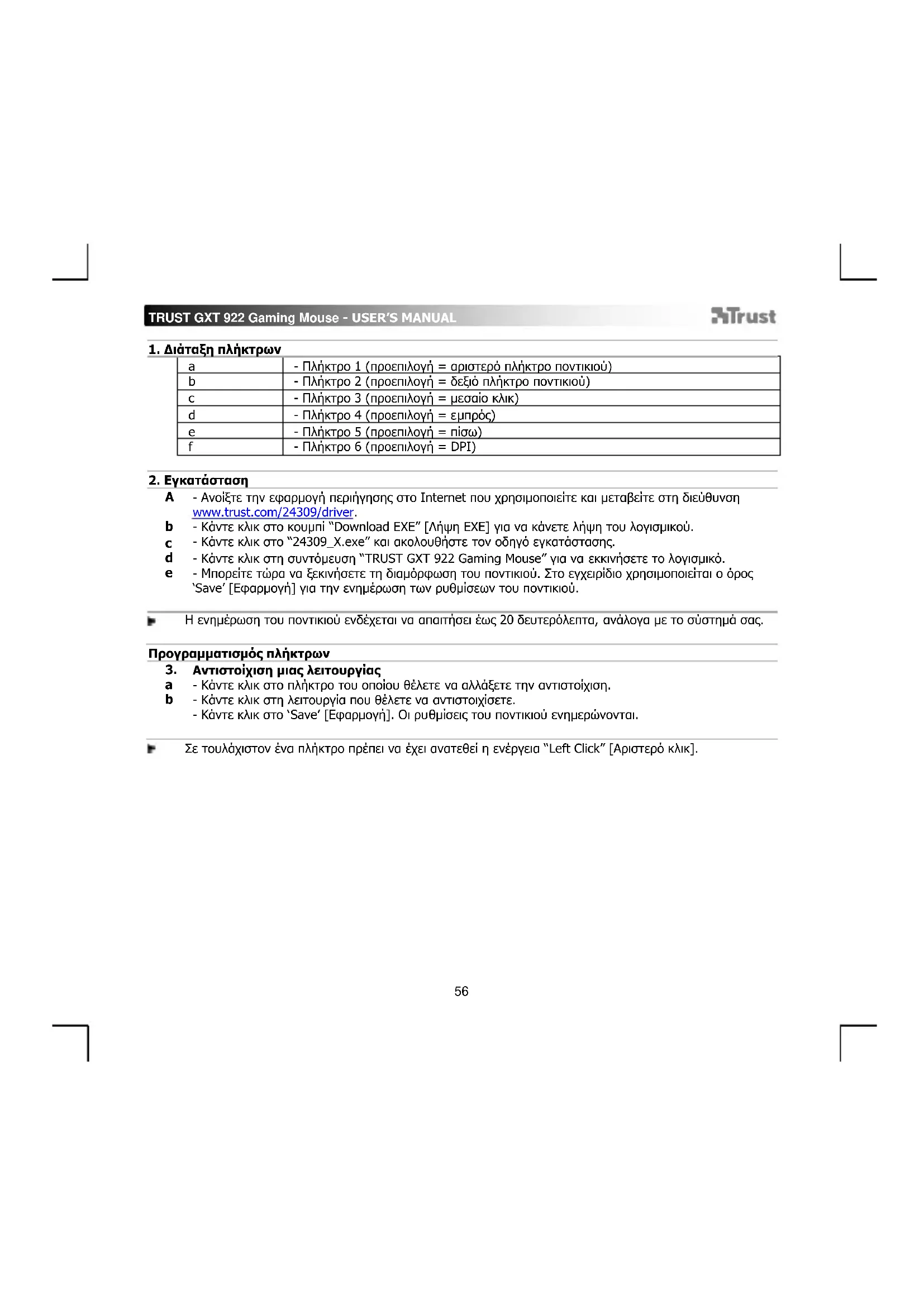 - Ανοίξτε την εφαρμογή περιήγησης στο Internet που χρησιμοποιείτε και μεταβείτε στη διεύθυνση www.trust.com/24309/driver. - Κάντε κλικ στο κουμπί “Download EXE” [Λήψη EXE] για να κάνετε λήψη του λογισμικού. - Κάντε κλικ στο “24309_X.exe” και ακολουθήστε τον οδηγό εγκατάστασης. - Κάντε κλικ στη συντόμευση “TRUST GXT 922 Gaming Mouse” για να εκκινήσετε το λογισμικό. - Μπορείτε τώρα να ξεκινήσετε τη διαμόρφωση του ποντικιού. Στο εγχειρίδιο χρησιμοποιείται ο όρος ‘Save’ [Εφαρμογή] για την ενημέρωση των ρυθμίσεων του ποντικιού. Η ενημέρωση του ποντικιού ενδέχεται να απαιτήσει έως 20 δευτερόλεπτα, ανάλογα με το σύστημά σας. Προγραμματισμός πλήκτρων