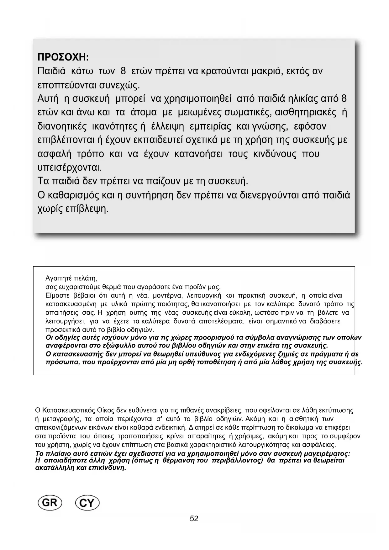 Παιδιά κάτω των 8 ετών πρέπει να κρατούνται µακριά, εκτός αν εποπτεύονται συνεχώς. Αυτή η συσκευή µπορεί να χρησιµοποιηθεί από παιδιά ηλικίας από 8 ετών και άνω και τα άτοµα µε µειωµένες σωµατικές, αισθητηριακές ή διανοητικές ικανότητες ή έλλειψη εµπειρίας και γνώσης, εφόσον επιβλέπονται ή έχουν εκπαιδευτεί σχετικά µε τη χρήση της συσκευής µε ασφαλή τρόπο και να έχουν κατανοήσει τους κινδύνους που υπεισέρχονται. Τα παιδιά δεν πρέπει να παίζουν µε τη συσκευή. Ο καθαρισµός και η συντήρηση δεν πρέπει να διενεργούνται από παιδιά χωρίς επίβλεψη. Αγαπητέ πελάτη, σας ευχαριστούµε θερµά που αγοράσατε ένα προϊόν µας. Είµαστε βέβαιοι ότι αυτή η νέα, µοντέρνα, λειτουργική και πρακτική συσκευή, η οποία είναι κατασκευασµένη µε υλικά πρώτης ποιότητας, θα ικανοποιήσει µε τον καλύτερο δυνατό τρόπο τις απαιτήσεις σας. Η χρήση αυτής της νέας συσκευής είναι εύκολη, ωστόσο πριν να τη βάλετε να λειτουργήσει, για να έχετε τα καλύτερα δυνατά αποτελέσµατα, είναι σηµαντικό να διαβάσετε προσεκτικά αυτό το βιβλίο οδηγιών. Οι οδηγίες αυτές ισχύουν µόνο για τις χώρες προορισµού τα σύµβολα αναγνώρισης των οποίων αναφέρονται στο εξώφυλλο αυτού του βιβλίου οδηγιών και στην ετικέτα της συσκευής. Ο κατασκευαστής δεν µπορεί να θεωρηθεί υπεύθυνος για ενδεχόµενες ζηµιές σε πράγµατα ή σε πρόσωπα, που προέρχονται από µία µη ορθή τοποθέτηση ή από µία λάθος χρήση της συσκευής. Ο Κατασκευαστικός Οίκος δεν ευθύνεται για τις πιθανές ανακρίβειες, που οφείλονται σε λάθη εκτύπωσης ή µεταγραφής, τα οποία περιέχονται σ' αυτό το βιβλίο οδηγιών. Ακόµη και η αισθητική των απεικονιζόµενων εικόνων είναι καθαρά ενδεικτική. ∆ιατηρεί σε κάθε περίπτωση το δικαίωµα να επιφέρει στα προϊόντα του όποιες τροποποιήσεις κρίνει απαραίτητες ή χρήσιµες, ακόµη και προς το συµφέρον του χρήστη, χωρίς να έχουν επίπτωση στα βασικά χαρακτηριστικά λειτουργικότητας και ασφάλειας. Το πλαίσιο αυτό εστιών έχει σχεδιαστεί για να χρησιµοποιηθεί µόνο σαν συσκευή µαγειρέµατος: Η οποιαδήποτε άλλη χρήση (όπως η θέρµανση του περιβάλλοντος) θα πρέπει να θεωρείται ακατάλληλη και επικίνδυνη.53 ΤΎΠΟΣ: PCK 306090 1 DUAL Καυστήρας του 6000 W 2 Καυστήρας ταχύς του 3000 W 3 Καυστήρας ηµι-ταχύς του 1750 W 4 Καυστήρας εφεδρικός του 1000 W 5 Πλέγµα από 6 ∆ιακόπτης χειρισµού καυστήρα αρ. 1 7 ∆ιακόπτης χειρισµού καυστήρα αρ. 2 8 ∆ιακόπτης χειρισµού καυστήρα αρ. 3 9 ∆ιακόπτης χειρισµού καυστήρα αρ. 4 Προσοχή: η συσκευή αυτή σχεδιάστηκε για οικιακή χρήση, σε κατοικίες και από ιδιώτες. GWS3811.0ED GKS9851.0ED GKS3820.0ED ΠΕΡΙΓΡΑΦΗ ΠΛΑΙΣΙΩΝ ΕΣΤΙΩΝ54 ΤΎΠΟΣ: PCZJ 6075 ΤΎΠΟΣ: PCZJ 90 1 Καυστήρας διπλό στέµµα WOK του 4000 W 2 Καυστήρας ταχύς του 3000 W 3 Καυστήρας ηµι-ταχύς του 1750 W 4 Καυστήρας εφεδρικός του 1000 W 5 Πλέγµα από 6 Πλέγµα από WOK (µόνο σε διπλό καυστήρα στέµµα και DUAL) 7 ∆ιακόπτης χειρισµού καυστήρα αρ. 3 8 ∆ιακόπτης χειρισµού καυστήρα αρ. 4 9 ∆ιακόπτης χειρισµού καυστήρα αρ. 2 10 ∆ιακόπτης χειρισµού καυστήρα αρ. 1 25 DUAL Καυστήρας του 4750 ÷ 5000 W 28 ∆ιακόπτης χειρισµού καυστήρα αρ. 25 Προσοχή: η συσκευή αυτή σχεδιάστηκε για οικιακή χρήση, σε κατοικίες και από ιδιώτες.