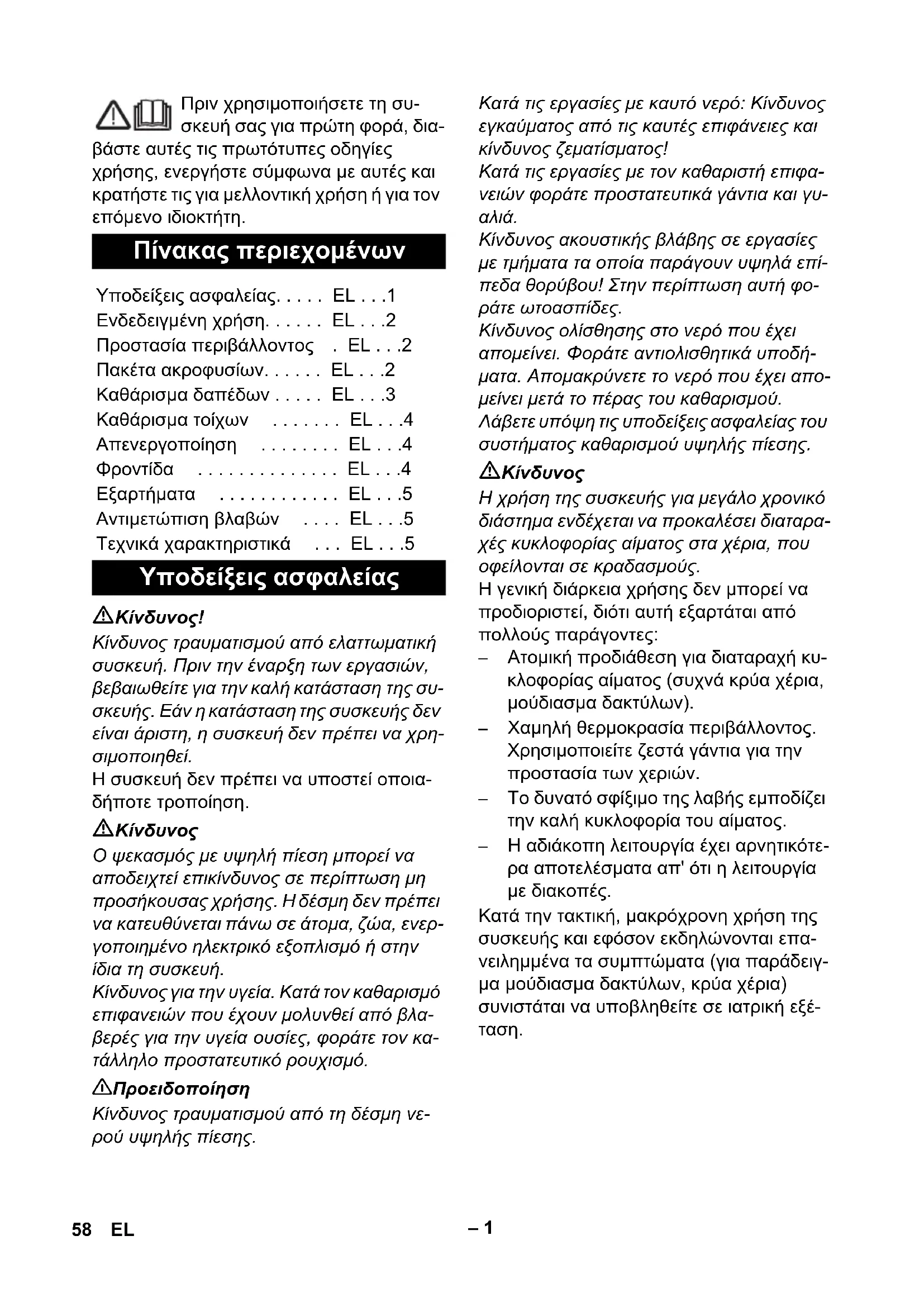 Ο ψεκασμός με υψηλή πίεση μπορεί να αποδειχτεί επικίνδυνος σε περίπτωση μη προσήκουσας χρήσης. Η δέσμη δεν πρέπει να κατευθύνεται πάνω σε άτομα, ζώα, ενερ- γοποιημένο ηλεκτρικό εξοπλισμό ή στην ίδια τη συσκευή. Κίνδυνος για την υγεία. Κατά τον καθαρισμό επιφανειών που έχουν μολυνθεί από βλα- βερές για την υγεία ουσίες, φοράτε τον κα- τάλληλο προστατευτικό ρουχισμό. 몇 Προειδοποίηση Κίνδυνος τραυματισμού από τη δέσμη νε- ρού υψηλής πίεσης. Κατά τις εργασίες με καυτό νερό: Κίνδυνος εγκαύματος από τις καυτές επιφάνειες και κίνδυνος ζεματίσματος! Κατά τις εργασίες με τον καθαριστή επιφα- νειών φοράτε προστατευτικά γάντια και γυ-