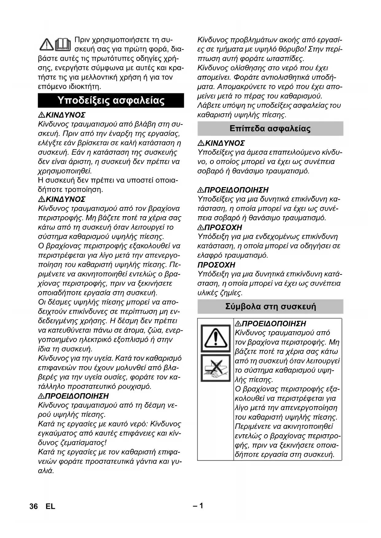 οποία μπορεί να έχει ως συνέπεια υλικές ζημίες. Υποδείξεις ασφαλείας Επίπεδα ασφαλείας Σύμβολα στη συσκευή 몇 ΠΡΟΕΙΔΟΠΟΙΗΣΗ Κίνδυνος τραυματισμού από τον βραχίονα περιστροφής. Μη βάζετε ποτέ τα χέρια σας κάτω από τη συσκευή όταν λειτουργεί το σύστημα καθαρισμού υψη- λής πίεσης. Ο βραχίονας περιστροφής εξα- κολουθεί να περιστρέφεται για λίγο μετά την απενεργοποίηση του καθαριστή υψηλής πίεσης. Περιμένετε να ακινητοποιηθεί εντελώς ο βραχίονας περιστρο- φής, πριν να ξεκινήσετε οποια- δήποτε εργασία στη συσκευή. 36 EL– 2 Η συσκευή καθαρισμού δαπέδων είναι κα- τάλληλη για τον καθαρισμό δαπέδων σε συνδυασμό με μια συσκευή καθαρισμού υψηλής πίεσης. Μέγιστη πίεση νερού 25 MPa (250 bar). Μέγιστη θερμοκρασία νερού 85 °C. Το βρώμικο νερό μπορεί να εκρεύσει από έναν ελαστικό σωλήνα. Τα υλικά συσκευασίας είναι ανακυ- κλώσιμα. Μην πετάτε τη συσκευασία στα οικιακά απορρίμματα, αλλά παραδώ- στε την προς ανακύκλωση. Οι παλιές συσκευές περιέχουν ανα- κυκλώσιμα υλικά, τα οποία θα πρέπει να παραδίδονται προς επαναχρησι- μοποίηση. Για το λόγο αυτό αποσύρετε τις παλιές συσκευές με κατάλληλες διαδικασί- ες συγκέντρωσης αποβλήτων. Υποδείξεις για τα συστατικά (REACH) Ενημερωμένες πληροφορίες για τα συστα- τικά μπορείτε να βρείτε στη διεύθυνση: www.kaercher.com/REACH Για να γίνει δυνατή η απρόσκοπτη λειτουρ- γία της συσκευής καθαρισμού υψηλής πίε- σης, θα πρέπει να χρησιμοποιήσετε το σω- στό ακροφύσιο υψηλής πίεσης.