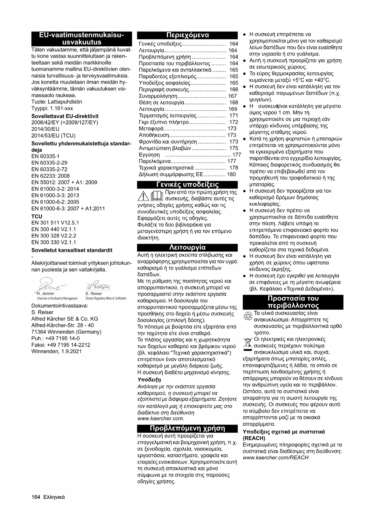 Allekirjoittaneet toimivat yrityksen johtokun- nan puolesta ja sen valtakirjalla. Dokumentointivastaava: S. Reiser Alfred Kärcher SE & Co. KG Alfred-Kärcher-Str. 28 - 40 71364 Winnenden (Germany) Puh.: +49 7195 14-0 Faksi: +49 7195 14-2212 Winnenden, 1.9.2021 Περιεχόμενα Γενικές υποδείξεις Πριν από την πρώτη χρήση της συσκευής, διαβάστε αυτές τις γνήσιες οδηγίες χρήσης καθώς και τις συνοδευτικές υποδείξεις ασφαλείας. Εφαρμόζετε αυτές τις οδηγίες. Φυλάξτε τα δύο βιβλιαράκια για μεταγενέστερη χρήση ή για τον επόμενο