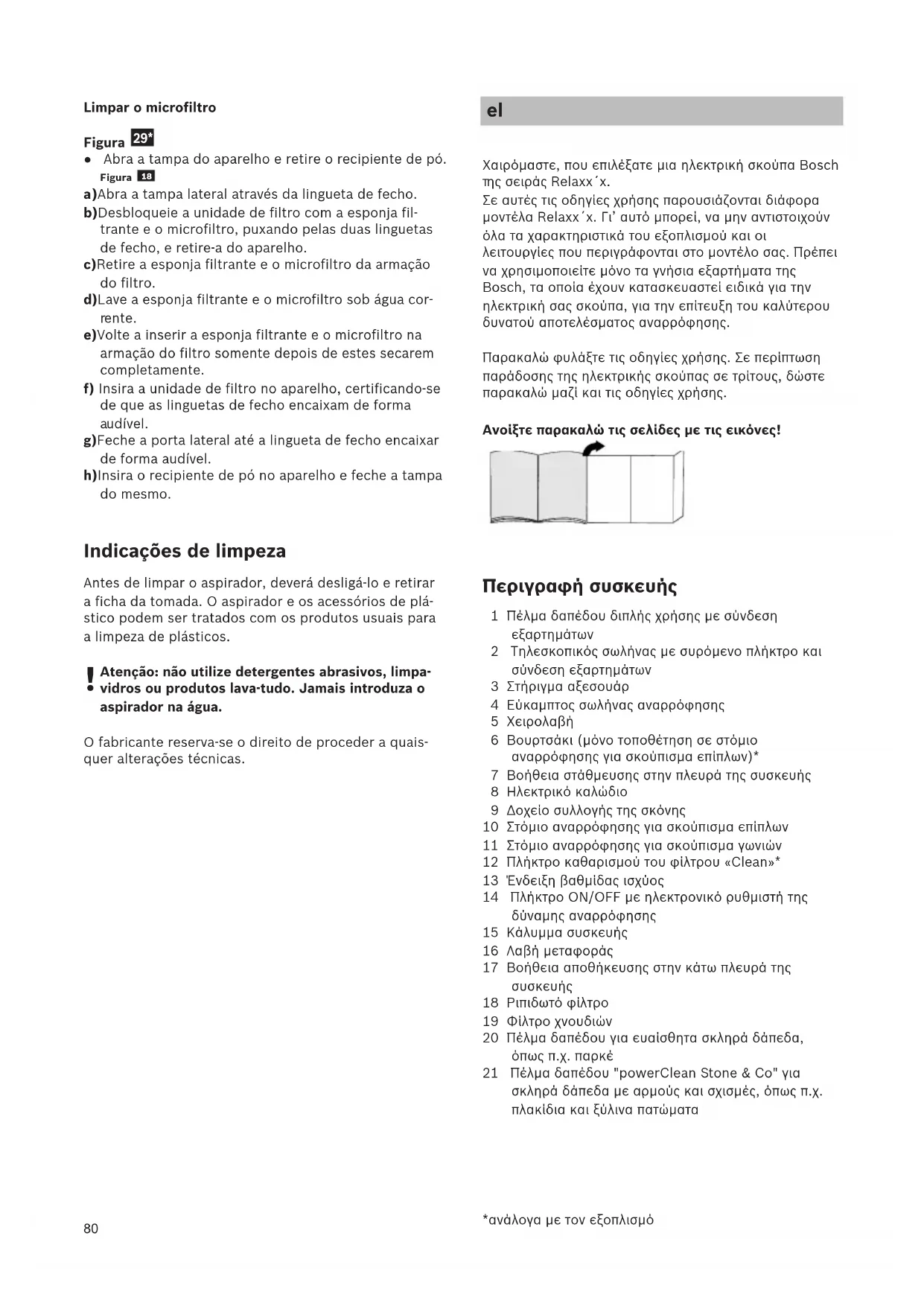 ης σειράς Relaxx´x. Σε αυτές τις οδηγίες χρήσης παρουσιάζονται διάφορα μοντέλα Relaxx´x. Γι’ αυτό μπορεί, να μην αντιστοιχούν όλα τα χαρακτηριστικά του εξοπλισμού και οι λειτουργίες που περιγράφονται στο μοντέλο σας. Πρέπει να χρησιμοποιείτε μόνο τα γνήσια εξαρτήματα της Bosch, τα οποία έχουν κατασκευαστεί ειδικά για την ηλεκτρική σας σκούπα, για την επίτευξη του καλύτερου δυνατού αποτελέσματος αναρρόφησης. Παρακαλώ φυλάξτε τις οδηγίες χρήσης. Σε περίπτωση παράδοσης της ηλεκτρικής σκούπας σε τρίτους, δώστε παρακαλώ μαζί και τις οδηγίες χρήσης. Ανοίξτε παρακαλώ τις σελίδες με τις εικόνες! Περιγραφή συσκευής 1 Πέλμα δαπέδου διπλής χρήσης με σύνδεση εξαρτημάτων 2 Τηλεσκοπικός σωλήνας με συρόμενο πλήκτρο και σύνδεση εξαρτημάτων 3 Στήριγμα αξεσουάρ 4 Εύκαμπτος σωλήνας αναρρόφησης 5 Χειρολαβή 6 Βουρτσάκι (μόνο τοποθέτηση σε στόμιο αναρρόφησης για σκούπισμα επίπλων)* 7 Βοήθεια στάθμευσης στην πλευρά της συσκευής 8 Ηλεκτρικό καλώδιο 9 Δοχείο συλλογής της σκόνης 10 Στόμιο αναρρόφησης για σκούπισμα επίπλων 11 Στόμιο αναρρόφησης για σκούπισμα γωνιών 12 Πλήκτρο καθαρισμού του φίλτρου «Clean»* 13 Ένδειξη βαθμίδας ισχύος 14 Πλήκτρο ON/OFF με ηλεκτρονικό ρυθμιστή της δύναμης αναρρόφησης 15 Κάλυμμα συσκευής 16 Λαβή μεταφοράς 17 Βοήθεια αποθήκευσης στην κάτω πλευρά της
