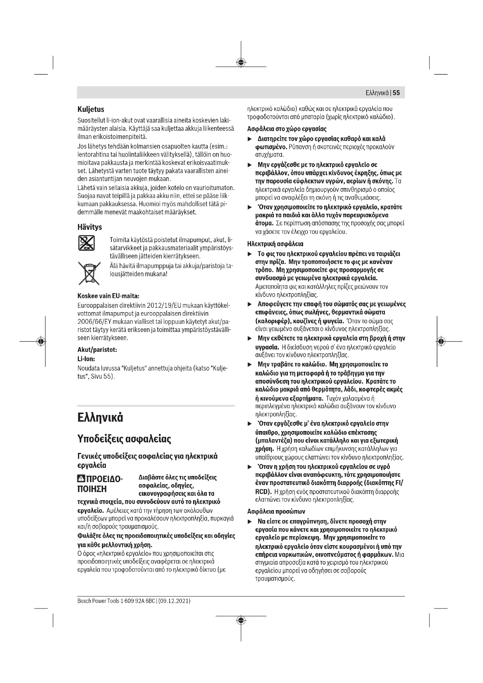 u Μην εργάζεσθε με το ηλεκτρικό εργαλείο σε περιβάλλον, όπου υπάρχει κίνδυνος έκρηξης, όπως με την παρουσία εύφλεκτων υγρών, αερίων ή σκόνης. Τα ηλεκτρικά εργαλεία δημιουργούν σπινθηρισμό ο οποίος μπορεί να αναφλέξει τη σκόνη ή τις αναθυμιάσεις. u Όταν χρησιμοποιείτε το ηλεκτρικό εργαλείο, κρατάτε μακριά τα παιδιά και άλλα τυχόν παρευρισκόμενα άτομα. Σε περίπτωση απόσπασης της προσοχής σας μπορεί να χάσετε τον έλεγχο του εργαλείου. Ηλεκτρική ασφάλεια u Το φις του ηλεκτρικού εργαλείου πρέπει να ταιριάζει στην πρίζα. Μην τροποποιήσετε το φις με κανέναν τρόπο. Μη χρησιμοποιείτε φις προσαρμογής σε συνδυασμό με γειωμένα ηλεκτρικά εργαλεία. Αμεταποίητα φις και κατάλληλες πρίζες μειώνουν τον κίνδυνο ηλεκτροπληξίας. u Αποφεύγετε την επαφή του σώματός σας με γειωμένες επιφάνειες, όπως σωλήνες, θερμαντικά σώματα (καλοριφέρ), κουζίνες ή ψυγεία. Όταν το σώμα σας είναι γειωμένο αυξάνεται ο κίνδυνος ηλεκτροπληξίας. u Μην εκθέτετε τα ηλεκτρικά εργαλεία στη βροχή ή στην υγρασία. Η διείσδυση νερού σ’ ένα ηλεκτρικό εργαλείο αυξάνει τον κίνδυνο ηλεκτροπληξίας. u Μην τραβάτε το καλώδιο. Μη χρησιμοποιείτε το καλώδιο για τη μεταφορά ή το τράβηγμα για την αποσύνδεση του ηλεκτρικού εργαλείου. Κρατάτε το καλώδιο μακριά από θερμότητα, λάδι, κοφτερές ακμές ή κινούμενα εξαρτήματα. Τυχόν χαλασμένα ή περιπλεγμένα ηλεκτρικά καλώδια αυξάνουν τον κίνδυνο ηλεκτροπληξίας. u Όταν εργάζεσθε μ’ ένα ηλεκτρικό εργαλείο στην ύπαιθρο, χρησιμοποιείτε καλώδιο επέκτασης (μπαλαντέζα) που είναι κατάλληλο και για εξωτερική χρήση. Ηχρήση καλωδίων επιμήκυνσης κατάλληλων για υπαίθριους χώρους ελαττώνει τον κίνδυνο ηλεκτροπληξίας. u Όταν η χρήση του ηλεκτρικού εργαλείου σε υγρό περιβάλλον είναι αναπόφευκτη, τότε χρησιμοποιήστε έναν προστατευτικό διακόπτη διαρροής (διακόπτηςFI/ RCD). Ηχρήση ενός προστατευτικού διακόπτη διαρροής ελαττώνει τον κίνδυνο ηλεκτροπληξίας. Ασφάλεια προσώπων u Να είστε σε επαγρύπνηση, δίνετε προσοχή στην εργασία που κάνετε και χρησιμοποιείτε το ηλεκτρικό εργαλείο με περίσκεψη. Μην χρησιμοποιείτε το ηλεκτρικό εργαλείο όταν είστε κουρασμένοι ή υπό την επήρεια ναρκωτικών, οινοπνεύματος ή φαρμάκων. Μια στιγμιαία απροσεξία κατά το χειρισμό του ηλεκτρικού εργαλείου μπορεί να οδηγήσει σε σοβαρούς τραυματισμούς. Bosch Power Tools 1 609 92A 6BC | (09.12.2021)56 | Ελληνικά u Χρησιμοποιείτε τον προσωπικό εξοπλισμό προστασίας. Φοράτε πάντα προστατευτικά γυαλιά. Ο κατάλληλος προστατευτικός εξοπλισμός, όπως μάσκα προστασίας από σκόνη, αντιολισθητικά υποδήματα ασφαλείας, προστατευτικό κράνος ή ωτασπίδες, ανάλογα με τις εκάστοτε συνθήκες, ελαττώνει τον κίνδυνο τραυματισμών. u Αποφεύγετε την αθέλητη εκκίνηση. Βεβαιωθείτε, ότι ο διακόπτης είναι στη θέση Off, πριν συνδέσετε το ηλεκτρικό εργαλείο με την πηγή τροφοδοσίας και/ή την μπαταρία καθώς και πριν το παραλάβετε ή το μεταφέρετε. Όταν μεταφέρετε τα ηλεκτρικά εργαλεία έχοντας το δάχτυλό σας στο διακόπτη ή όταν συνδέσετε τα ηλεκτρικά εργαλεία με την πηγή ρεύματος όταν αυτά είναι ακόμη στη θέση ΟΝ, τότε δημιουργείται κίνδυνος τραυματισμών. u Απομακρύνετε από το ηλεκτρικό εργαλείο τυχόν εξαρτήματα ρύθμισης ή κλειδιά πριν θέσετε το ηλεκτρικό εργαλείο σε λειτουργία. Ένα εργαλείο ή κλειδί συναρμολογημένο σ’ ένα περιστρεφόμενο τμήμα ενός ηλεκτρικού εργαλείου μπορεί να οδηγήσει σε τραυματισμούς. u Προσέχετε πως στέκεστε. Φροντίζετε