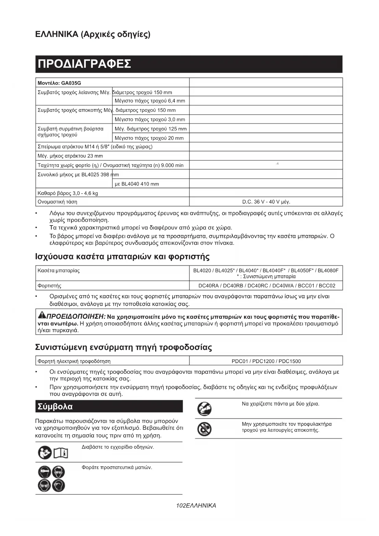 NOTA: Alguns itens da lista podem estar incluídos na embalagem da ferramenta como acessórios padrão. Eles podem variar de país para país.102 ΕΛΛΗΝΙΚΑ ΕΛΛΗΝΙΚΑ (Αρχικές οδηγίες) ΠΡΟΔΙΑΓΡΑΦΕΣ Μοντέλο: GA035G Συμβατός τροχός λείανσης Μέγ. διάμετρος τροχού 150 mm Μέγιστο πάχος τροχού 6,4 mm Συμβατός τροχός αποκοπής Μέγ. διάμετρος τροχού 150 mm Μέγιστο πάχος τροχού 3,0 mm Συμβατή συρμάτινη βούρτσα σχήματος τροχού Μέγ. διάμετρος τροχού 125 mm Μέγιστο πάχος τροχού 20 mm Σπείρωμα ατράκτου M14 ή 5/8″ (ειδικό της χώρας) Μέγ. μήκος ατράκτου 23 mm Ταχύτητα χωρίς φορτίο (n