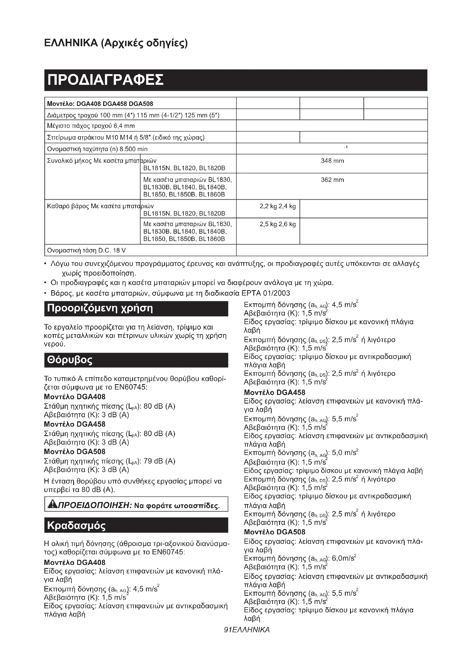 Η ολική τιμή δόνησης (άθροισμα τρι-αξονικού διανύσμα- τος) καθορίζεται σύμφωνα με το EN60745: Μοντέλο DGA408 Είδος εργασίας: λείανση επιφανειών με κανονική πλά-