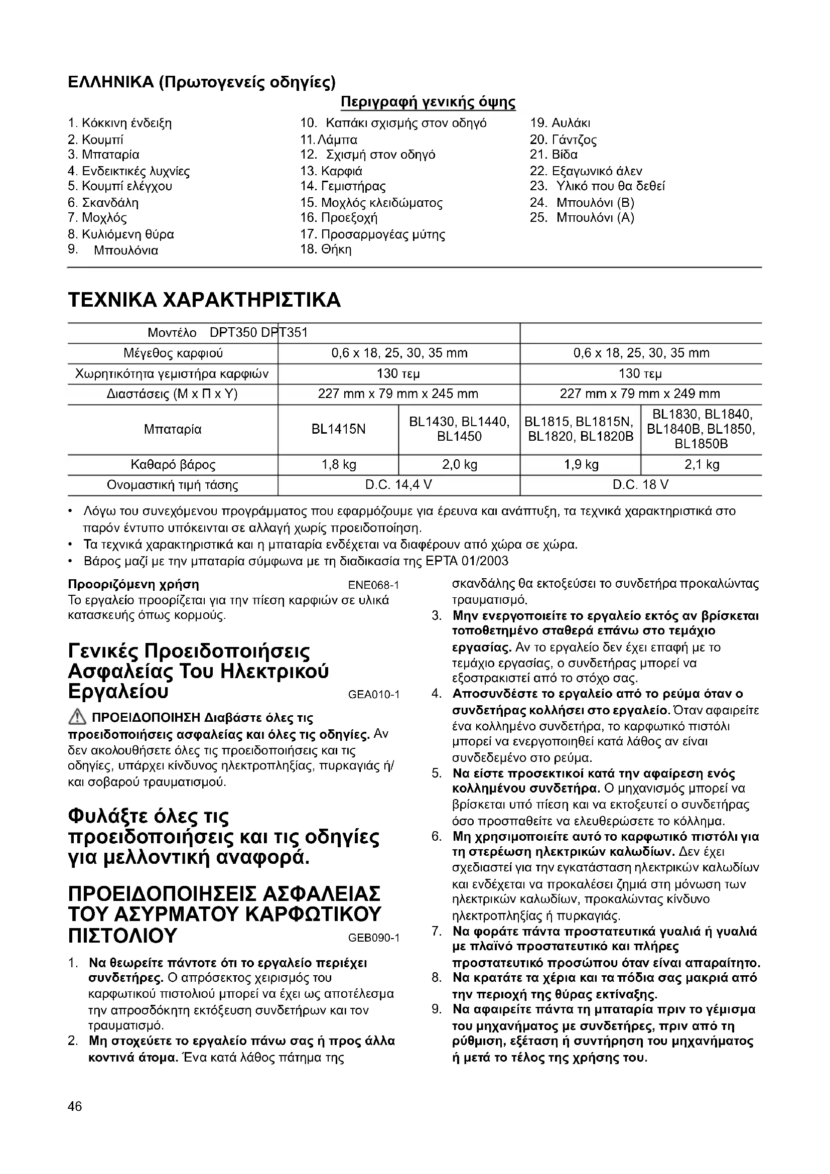 Μοντέλο DPT350 DPT351 Μέγεθος καρφιού 0,6 x 18, 25, 30, 35 mm 0,6 x 18, 25, 30, 35 mm Χωρητικότητα γεμιστήρα καρφιών 130 τεμ 130 τεμ ∆ιαστάσεις (Μ x Π x Υ) 227 mm x 79 mm x 245 mm 227 mm x 79 mm x 249 mm Μπαταρία BL1415N BL1430, BL1440, BL1450 BL1815, BL1815N, BL1820, BL1820B BL1830, BL1840, BL1840B, BL1850, BL1850B Καθαρό βάρος 1,8 kg 2,0 kg 1,9 kg 2,1 kg Ονομαστική τιμή τάσης D.C. 14,4 V D.C. 18 V47