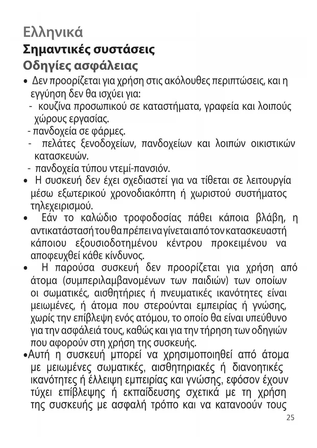 - Η παρούσα συσκευή δεν προορίζεται για χρήση από άτομα (συμπεριλαμβανομένων των παιδιών) των οποίων οι σωματικές, αισθητήριες ή πνευματικές ικανότητες είναι μειωμένες, ή άτομα που στερούνται εμπειρίας ή γνώσης, χωρίς την επίβλεψη ενός ατόμου, το οποίο θα είναι υπεύθυνο για την ασφάλειά τους, καθώς και για την τήρηση των οδηγιών που αφορούν στη χρήση της συσκευής.
