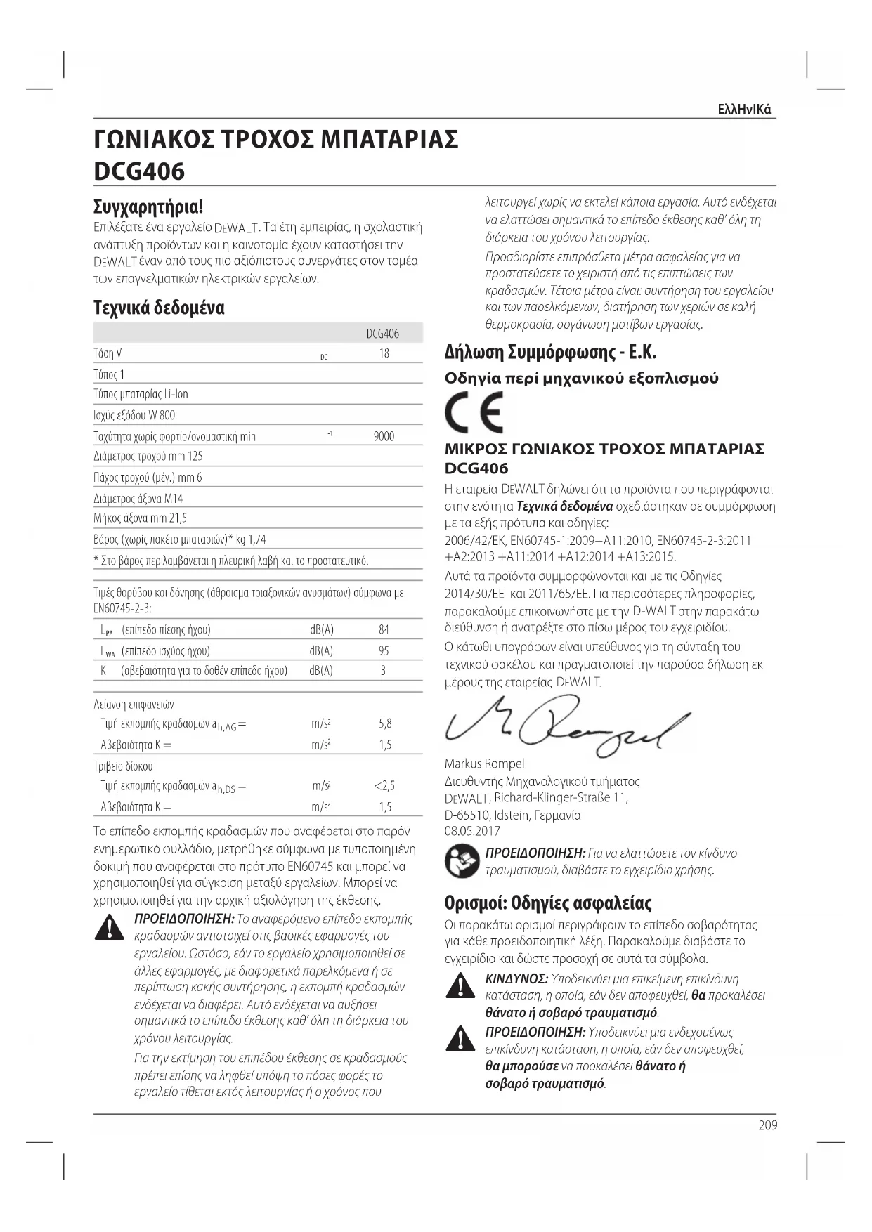 Auta ta npoiovta ouuopowovtai kai tic Odyiec 2014/30/EE kai 2011/65/EE. Ia nepiaooTepc nnpoxopiec, npapaalouue eikoiwovnote tyn DEWALT otyn npapakatw i n avatpeTe oTo niaw epoc Tou yxepidou.