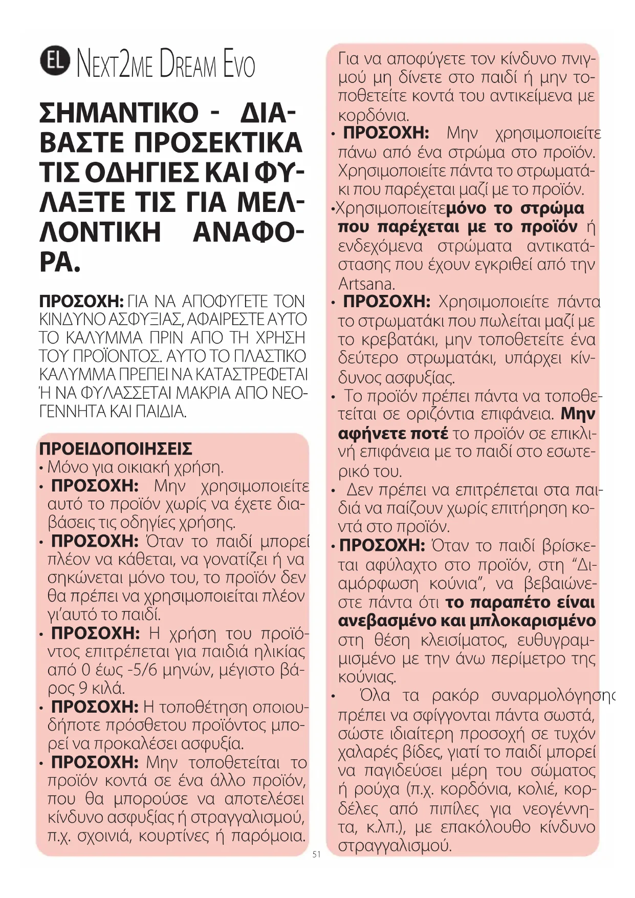 - IPOSOXH: MHN XPHSIMOI-OITE TO IPOIOv OTN "DIAUOPWON KOUVA" N/KAI "DIAUOPWON Co-Sleeping (STEPWON OTO KPEBATI)" AV OIOOBNOTE EAPNTMA AELTEI, EIVAI KAETOPAUMEVO N OTAOMEVO. EAV EIVAI ANAPAITNTO, EIKOI-VWNOTE ME TNY Artsana SPA YIA AVTAAKTKA KAI OBNYIEC XPNONC. MHN ANTIKAOISTATE MEPN NOU LEINOV, POU VIAL KATETPAUMEVA N OTAOMEVA ME UYNOA EAPNTMA TNIPOV EXOUV EYKPIEi aTNO TNY Artsana SPA.