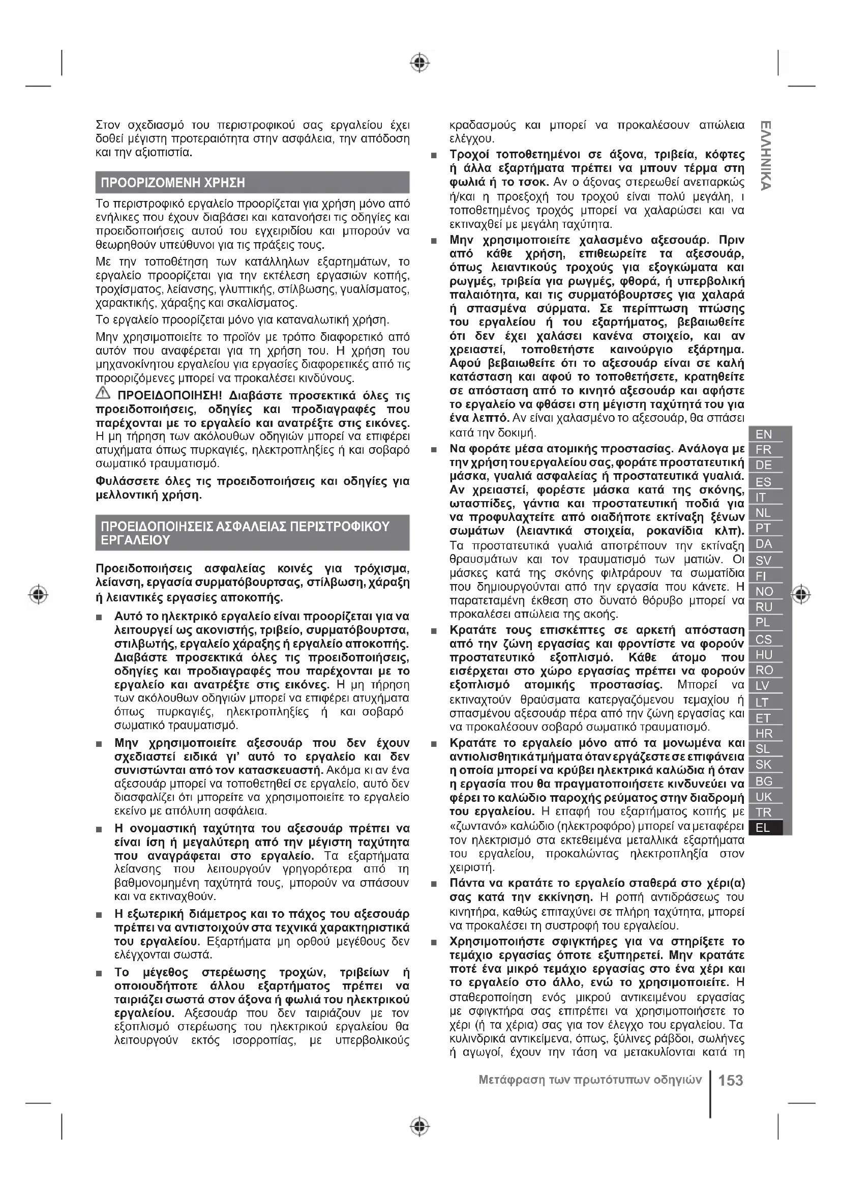 matlarΣτον σχεδιασμό του περιστροφικού σας εργαλείου έχει δοθεί μέγιστη προτεραιότητα στην ασφάλεια, την απόδοση και την αξιοπιστία. ΠΡΟΟΡΙΖΟΜΕΝΗ ΧΡΗΣΗ Το περιστροφικό εργαλείο προορίζεται για χρήση μόνο από ενήλικες που έχουν διαβάσει και κατανοήσει τις οδηγίες και προειδοποιήσεις αυτού του εγχειριδίου και μπορούν να θεωρηθούν υπεύθυνοι για τις πράξεις τους. Με την τοποθέτηση των κατάλληλων εξαρτημάτων, το εργαλείο προορίζεται για την εκτέλεση εργασιών κοπής, τροχίσματος, λείανσης, γλυπτικής, στίλβωσης, γυαλίσματος, χαρακτικής, χάραξης και σκαλίσματος. Το εργαλείο προορίζεται μόνο για καταναλωτική χρήση. Μην χρησιμοποιείτε το προϊόν με τρόπο διαφορετικό από αυτόν που αναφέρεται για τη χρήση του. Η χρήση του μηχανοκίνητου εργαλείου για εργασίες διαφορετικές από τις προοριζόμενες μπορεί να προκαλέσει κινδύνους. ΠΡΟΕΙΔΟΠΟΙΗΣΗ! Διαβάστε προσεκτικά όλες τις προειδοποιήσεις, οδηγίες και προδιαγραφές που παρέχονται με το εργαλείο και ανατρέξτε στις εικόνες. Η μη τήρηση των ακόλουθων οδηγιών μπορεί να επιφέρει ατυχήματα όπως πυρκαγιές, ηλεκτροπληξίες ή και σοβαρό σωματικό τραυματισμό. Φυλάσσετε όλες τις προειδοποιήσεις και οδηγίες για μελλοντική χρήση. ΠΡΟΕΙΔΟΠΟΙΗΣΕΙΣ ΑΣΦΑΛΕΙΑΣ ΠΕΡΙΣΤΡΟΦΙΚΟΥ