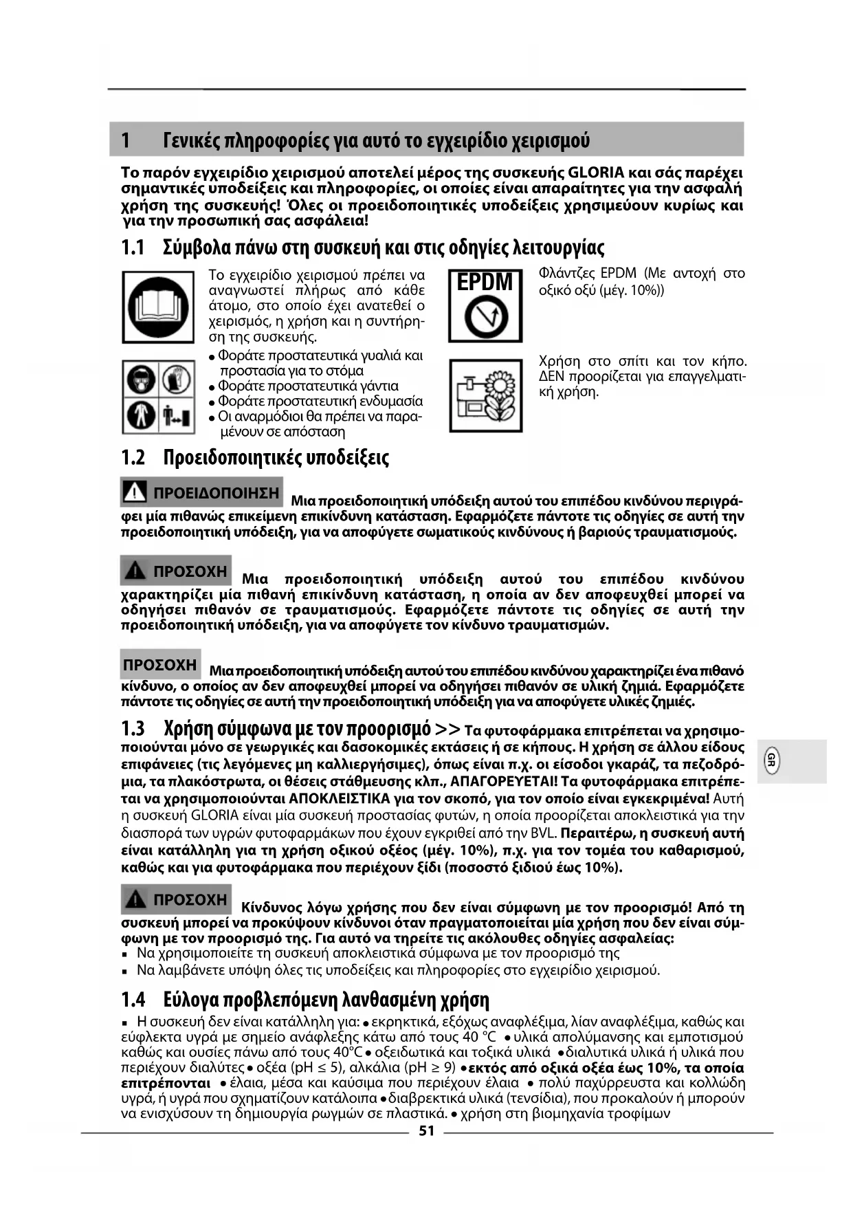 ποιούνται μόνο σε γεωργικές και δασοκομικές εκτάσεις ή σε κήπους. Η χρήση σε άλλου είδους επιφάνειες (τις λεγόμενες μη καλλιεργήσιμες), όπως είναι π.χ. οι είσοδοι γκαράζ, τα πεζοδρό- μια, τα πλακόστρωτα, οι θέσεις στάθμευσης κλπ., ΑΠΑΓΟΡΕΥΕΤΑΙ! Τα φυτοφάρμακα επιτρέπε- ται να χρησιμοποιούνται ΑΠΟΚΛΕΙΣΤΙΚΑ για τον σκοπό, για τον οποίο είναι εγκεκριμένα! Αυτή η συσκευή GLORIA είναι μία συσκευή προστασίας φυτών, η οποία προορίζεται αποκλειστικά για την διασπορά των υγρών φυτοφαρμάκων που έχουν εγκριθεί από την BVL. Περαιτέρω, η συσκευή αυτή είναι κατάλληλη για τη χρήση οξικού οξέος (μέγ. 10%), π.χ. για τον τομέα του καθαρισμού, καθώς και για φυτοφάρμακα που περιέχουν ξίδι (ποσοστό ξιδιού έως 10%). Κίνδυνος λόγω χρήσης που δεν είναι σύμφωνη με τον προορισμό! Από τη συσκευή μπορεί να προκύψουν κίνδυνοι όταν πραγματοποιείται μία χρήση που δεν είναι σύμ- φωνη με τον προορισμό της. Για αυτό να τηρείτε τις ακόλουθες οδηγίες ασφαλείας: