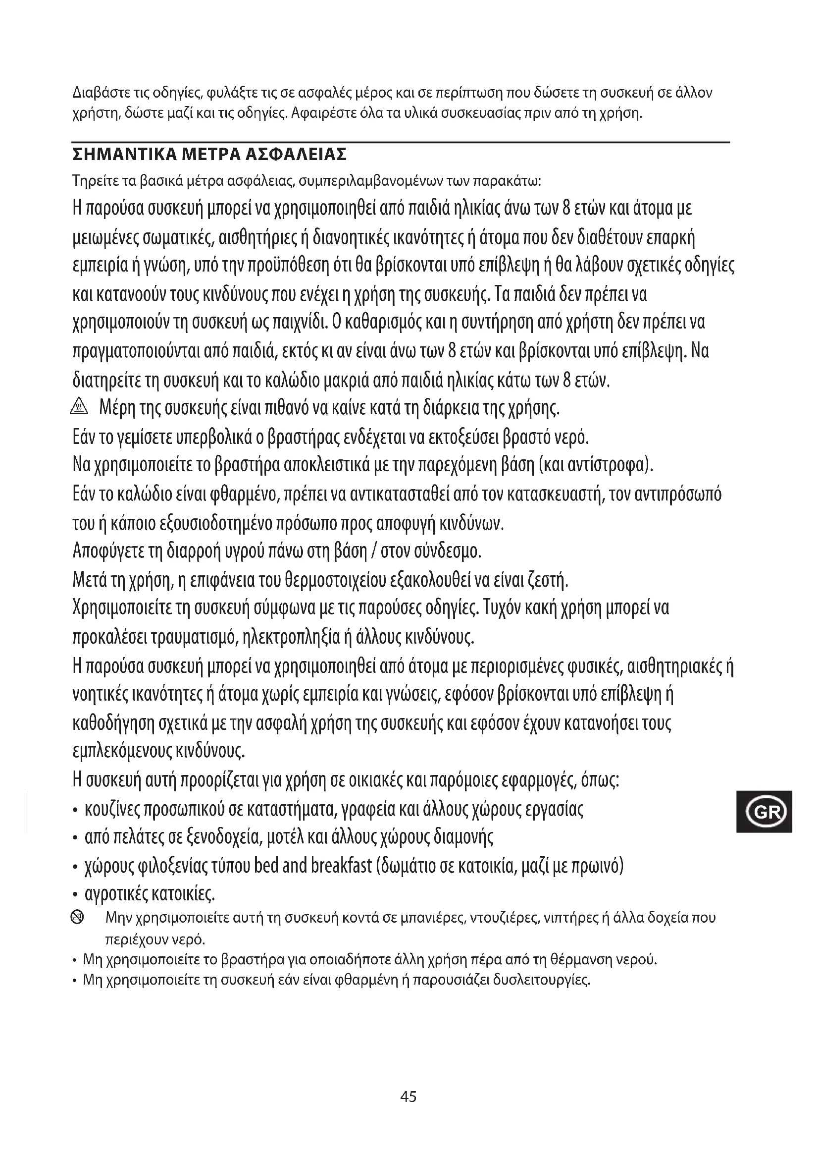 Τηρείτε τα βασικά μέτρα ασφάλειας, συμπεριλαμβανομένων των παρακάτω: Η παρούσα συσκευή μπορεί να χρησιμοποιηθεί από παιδιά ηλικίας άνω των 8 ετών και άτομα με μειωμένες σωματικές, αισθητήριες ή διανοητικές ικανότητες ή άτομα που δεν διαθέτουν επαρκή εμπειρία ή γνώση, υπό την προϋπόθεση ότι θα βρίσκονται υπό επίβλεψη ή θα λάβουν σχετικές οδηγίες και κατανοούν τους κινδύνους που ενέχει η χρήση της συσκευής. Τα παιδιά δεν πρέπει να χρησιμοποιούν τη συσκευή ως παιχνίδι. Ο καθαρισμός και η συντήρηση από χρήστη δεν πρέπει να πραγματοποιούνται από παιδιά, εκτός κι αν είναι άνω των 8 ετών και βρίσκονται υπό επίβλεψη. Να διατηρείτε τη συσκευή και το καλώδιο μακριά από παιδιά ηλικίας κάτω των 8 ετών. h Μέρη της συσκευής είναι πιθανό να καίνε κατά τη διάρκεια της χρήσης. Εάν το γεμίσετε υπερβολικά ο βραστήρας ενδέχεται να εκτοξεύσει βραστό νερό. Να χρησιμοποιείτε το βραστήρα αποκλειστικά με την παρεχόμενη βάση (και αντίστροφα). Εάν το καλώδιο είναι φθαρμένο, πρέπει να αντικατασταθεί από τον κατασκευαστή, τον αντιπρόσωπό του ή κάποιο εξουσιοδοτημένο πρόσωπο προς αποφυγή κινδύνων. Αποφύγετε τη διαρροή υγρού πάνω στη βάση / στον σύνδεσμο. Μετά τη χρήση, η επιφάνεια του θερμοστοιχείου εξακολουθεί να είναι ζεστή. Χρησιμοποιείτε τη συσκευή σύμφωνα με τις παρούσες οδηγίες. Τυχόν κακή χρήση μπορεί να προκαλέσει τραυματισμό, ηλεκτροπληξία ή άλλους κινδύνους. Η παρούσα συσκευή μπορεί να χρησιμοποιηθεί από άτομα με περιορισμένες φυσικές, αισθητηριακές ή νοητικές ικανότητες ή άτομα χωρίς εμπειρία και γνώσεις, εφόσον βρίσκονται υπό επίβλεψη ή καθοδήγηση σχετικά με την ασφαλή χρήση της συσκευής και εφόσον έχουν κατανοήσει τους εμπλεκόμενους κινδύνους. Η συσκευή αυτή προορίζεται για χρήση σε οικιακές και παρόμοιες εφαρμογές, όπως: