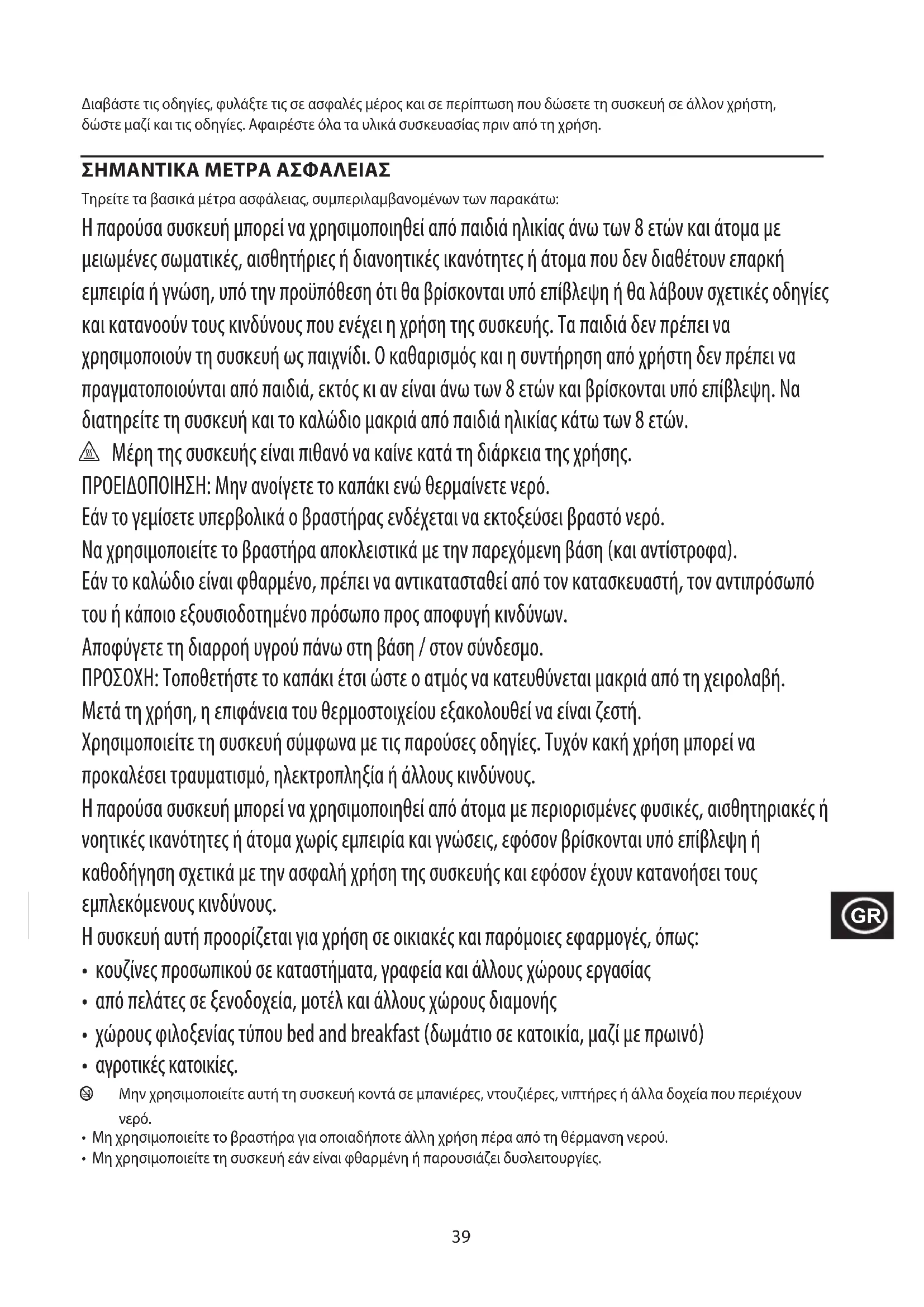 Τηρείτε τα βασικά μέτρα ασφάλειας, συμπεριλαμβανομένων των παρακάτω: Η παρούσα συσκευή μπορεί να χρησιμοποιηθεί από παιδιά ηλικίας άνω των 8 ετών και άτομα με μειωμένες σωματικές, αισθητήριες ή διανοητικές ικανότητες ή άτομα που δεν διαθέτουν επαρκή εμπειρία ή γνώση, υπό την προϋπόθεση ότι θα βρίσκονται υπό επίβλεψη ή θα λάβουν σχετικές οδηγίες και κατανοούν τους κινδύνους που ενέχει η χρήση της συσκευής. Τα παιδιά δεν πρέπει να χρησιμοποιούν τη συσκευή ως παιχνίδι. Ο καθαρισμός και η συντήρηση από χρήστη δεν πρέπει να πραγματοποιούνται από παιδιά, εκτός κι αν είναι άνω των 8 ετών και βρίσκονται υπό επίβλεψη. Να διατηρείτε τη συσκευή και το καλώδιο μακριά από παιδιά ηλικίας κάτω των 8 ετών. h Μέρη της συσκευής είναι πιθανό να καίνε κατά τη διάρκεια της χρήσης. ΠΡΟΕΙΔΟΠΟΙΗΣΗ: Μην ανοίγετε το καπάκι ενώ θερμαίνετε νερό. Εάν το γεμίσετε υπερβολικά ο βραστήρας ενδέχεται να εκτοξεύσει βραστό νερό. Να χρησιμοποιείτε το βραστήρα αποκλειστικά με την παρεχόμενη βάση (και αντίστροφα). Εάν το καλώδιο είναι φθαρμένο, πρέπει να αντικατασταθεί από τον κατασκευαστή, τον αντιπρόσωπό του ή κάποιο εξουσιοδοτημένο πρόσωπο προς αποφυγή κινδύνων. Αποφύγετε τη διαρροή υγρού πάνω στη βάση / στον σύνδεσμο. ΠΡΟΣΟΧΗ: Τοποθετήστε το καπάκι έτσι ώστε ο ατμός να κατευθύνεται μακριά από τη χειρολαβή. Μετά τη χρήση, η επιφάνεια του θερμοστοιχείου εξακολουθεί να είναι ζεστή. Χρησιμοποιείτε τη συσκευή σύμφωνα με τις παρούσες οδηγίες. Τυχόν κακή χρήση μπορεί να προκαλέσει τραυματισμό, ηλεκτροπληξία ή άλλους κινδύνους. Η παρούσα συσκευή μπορεί να χρησιμοποιηθεί από άτομα με περιορισμένες φυσικές, αισθητηριακές ή νοητικές ικανότητες ή άτομα χωρίς εμπειρία και γνώσεις, εφόσον βρίσκονται υπό επίβλεψη ή καθοδήγηση σχετικά με την ασφαλή χρήση της συσκευής και εφόσον έχουν κατανοήσει τους εμπλεκόμενους κινδύνους. Η συσκευή αυτή προορίζεται για χρήση σε οικιακές και παρόμοιες εφαρμογές, όπως: