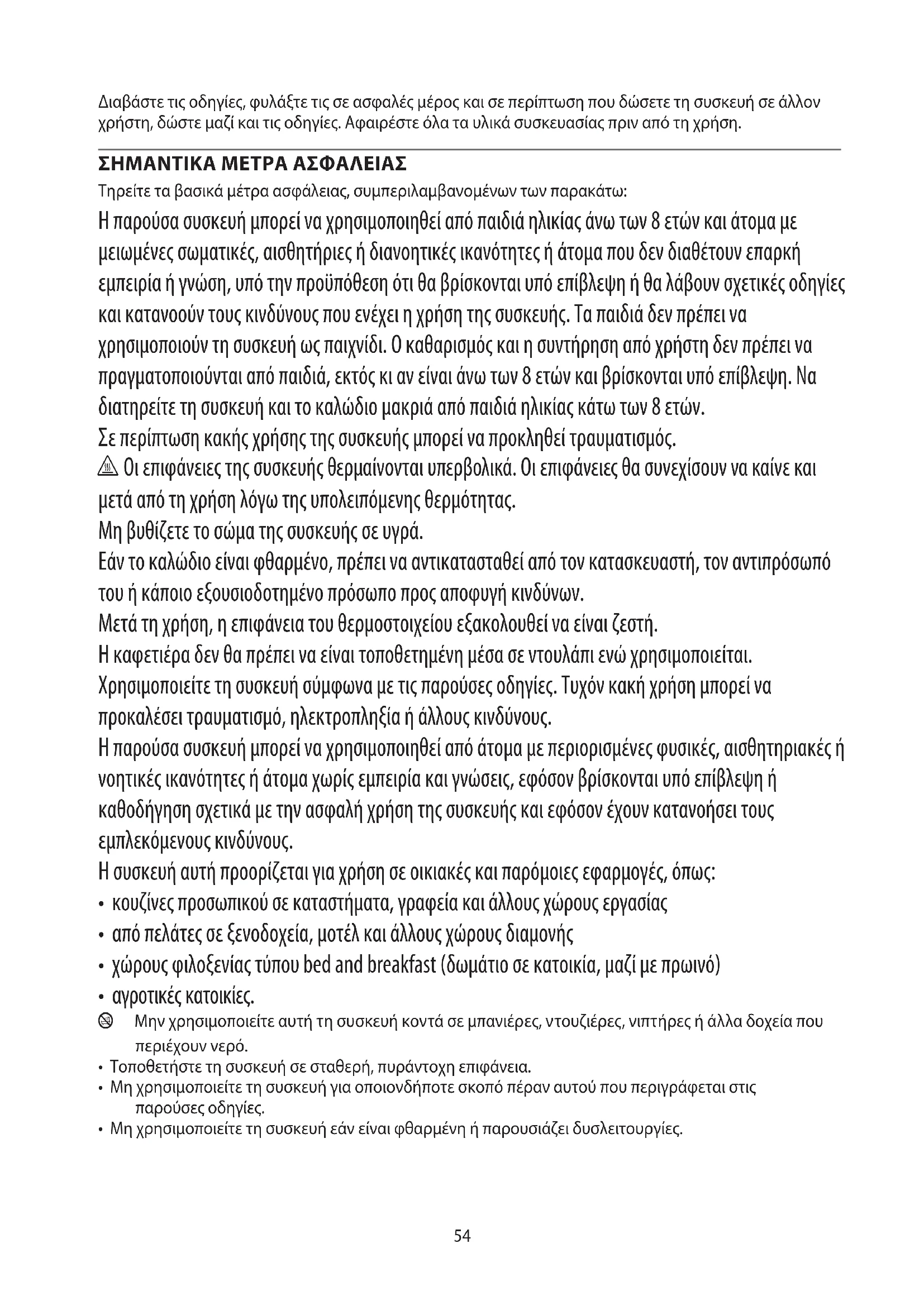 Τηρείτε τα βασικά μέτρα ασφάλειας, συμπεριλαμβανομένων των παρακάτω: Η παρούσα συσκευή μπορεί να χρησιμοποιηθεί από παιδιά ηλικίας άνω των 8 ετών και άτομα με μειωμένες σωματικές, αισθητήριες ή διανοητικές ικανότητες ή άτομα που δεν διαθέτουν επαρκή εμπειρία ή γνώση, υπό την προϋπόθεση ότι θα βρίσκονται υπό επίβλεψη ή θα λάβουν σχετικές οδηγίες και κατανοούν τους κινδύνους που ενέχει η χρήση της συσκευής. Τα παιδιά δεν πρέπει να χρησιμοποιούν τη συσκευή ως παιχνίδι. Ο καθαρισμός και η συντήρηση από χρήστη δεν πρέπει να πραγματοποιούνται από παιδιά, εκτός κι αν είναι άνω των 8 ετών και βρίσκονται υπό επίβλεψη. Να διατηρείτε τη συσκευή και το καλώδιο μακριά από παιδιά ηλικίας κάτω των 8 ετών. Σε περίπτωση κακής χρήσης της συσκευής μπορεί να προκληθεί τραυματισμός. h Οι επιφάνειες της συσκευής θερμαίνονται υπερβολικά. Οι επιφάνειες θα συνεχίσουν να καίνε και μετά από τη χρήση λόγω της υπολειπόμενης θερμότητας. Μη βυθίζετε το σώμα της συσκευής σε υγρά. Εάν το καλώδιο είναι φθαρμένο, πρέπει να αντικατασταθεί από τον κατασκευαστή, τον αντιπρόσωπό του ή κάποιο εξουσιοδοτημένο πρόσωπο προς αποφυγή κινδύνων. Μετά τη χρήση, η επιφάνεια του θερμοστοιχείου εξακολουθεί να είναι ζεστή. Η καφετιέρα δεν θα πρέπει να είναι τοποθετημένη μέσα σε ντουλάπι ενώ χρησιμοποιείται. Χρησιμοποιείτε τη συσκευή σύμφωνα με τις παρούσες οδηγίες. Τυχόν κακή χρήση μπορεί να προκαλέσει τραυματισμό, ηλεκτροπληξία ή άλλους κινδύνους. Η παρούσα συσκευή μπορεί να χρησιμοποιηθεί από άτομα με περιορισμένες φυσικές, αισθητηριακές ή νοητικές ικανότητες ή άτομα χωρίς εμπειρία και γνώσεις, εφόσον βρίσκονται υπό επίβλεψη ή καθοδήγηση σχετικά με την ασφαλή χρήση της συσκευής και εφόσον έχουν κατανοήσει τους εμπλεκόμενους κινδύνους. Η συσκευή αυτή προορίζεται για χρήση σε οικιακές και παρόμοιες εφαρμογές, όπως: