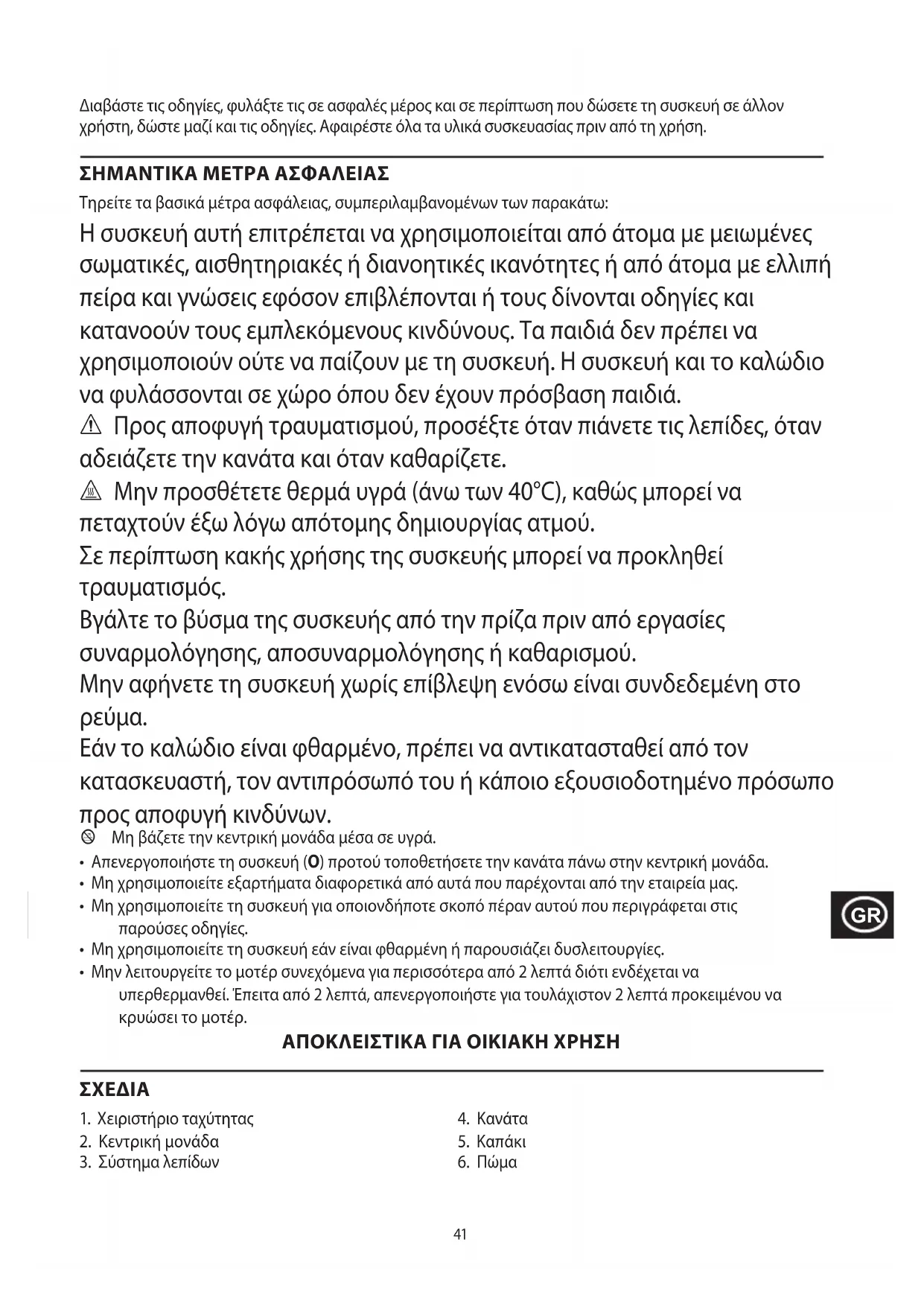 - Μην λειτουργείτε το μοτέρ συνεχόμενα για περισσότερα από 2 λεπτά διότι ενδέχεται να υπερθερμανθεί. Έπειτα από 2 λεπτά, απενεργοποιήστε για τουλάχιστον 2 λεπτά προκειμένου να κρυώσει το μοτέρ. ΑΠΟΚΛΕΙΣΤΙΚΑ ΓΙΑ ΟΙΚΙΑΚΗ ΧΡΗΣΗ