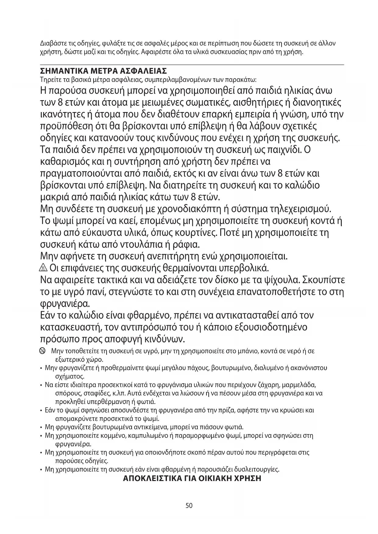 - Μη χρησιμοποιείτε τη συσκευή εάν είναι φθαρμένη ή παρουσιάζει δυσλειτουργίες. ΑΠΟΚΛΕΙΣΤΙΚΑ ΓΙΑ ΟΙΚΙΑΚΗ ΧΡΗΣΗ51