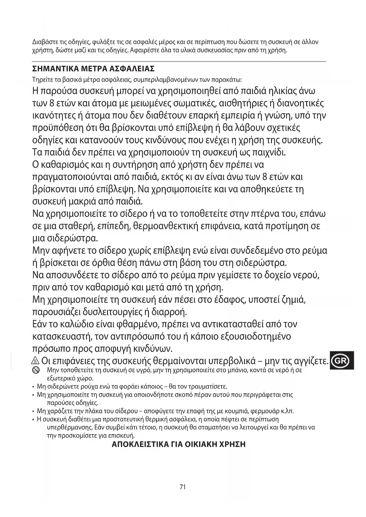 Τηρείτε τα βασικά μέτρα ασφάλειας, συμπεριλαμβανομένων των παρακάτω: Η παρούσα συσκευή μπορεί να χρησιμοποιηθεί από παιδιά ηλικίας άνω των 8 ετών και άτομα με μειωμένες σωματικές, αισθητήριες ή διανοητικές ικανότητες ή άτομα που δεν διαθέτουν επαρκή εμπειρία ή γνώση, υπό την προϋπόθεση ότι θα βρίσκονται υπό επίβλεψη ή θα λάβουν σχετικές οδηγίες και κατανοούν τους κινδύνους που ενέχει η χρήση της συσκευής. Τα παιδιά δεν πρέπει να χρησιμοποιούν τη συσκευή ως παιχνίδι. Ο καθαρισμός και η συντήρηση από χρήστη δεν πρέπει να πραγματοποιούνται από παιδιά, εκτός κι αν είναι άνω των 8 ετών και βρίσκονται υπό επίβλεψη. Να χρησιμοποιείτε και να αποθηκεύετε τη συσκευή μακριά από παιδιά. Να χρησιμοποιείτε το σίδερο ή να το τοποθετείτε στην πτέρνα του, επάνω σε μια σταθερή, επίπεδη, θερμοανθεκτική επιφάνεια, κατά προτίμηση σε μια σιδερώστρα. Μην αφήνετε το σίδερο χωρίς επίβλεψη ενώ είναι συνδεδεμένο στο ρεύμα ή βρίσκεται σε όρθια θέση πάνω στη βάση του στη σιδερώστρα. Να αποσυνδέετε το σίδερο από το ρεύμα πριν γεμίσετε το δοχείο νερού, πριν από τον καθαρισμό και μετά από τη χρήση. Μη χρησιμοποιείτε τη συσκευή εάν πέσει στο έδαφος, υποστεί ζημιά, παρουσιάζει δυσλειτουργίες ή διαρροή. Εάν το καλώδιο είναι φθαρμένο, πρέπει να αντικατασταθεί από τον κατασκευαστή, τον αντιπρόσωπό του ή κάποιο εξουσιοδοτημένο πρόσωπο προς αποφυγή κινδύνων. h Οι επιφάνειες της συσκευής θερμαίνονται υπερβολικά – μην τις αγγίζετε.