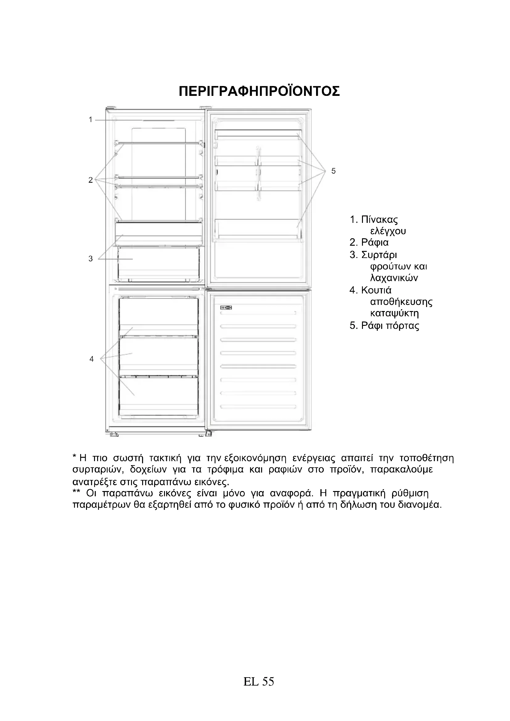 - Η πιο σωστή τακτική για την εξοικονόμηση ενέργειας απαιτεί την τοποθέτηση συρταριών, δοχείων για τα τρόφιμα και ραφιών στο προϊόν, παρακαλούμε ανατρέξτε στις παραπάνω εικόνες. ** Οι παραπάνω εικόνες είναι μόνο για αναφορά. Η πραγματική ρύθμιση παραμέτρων θα εξαρτηθεί από το φυσικό προϊόν ή από τη δήλωση του διανομέα.