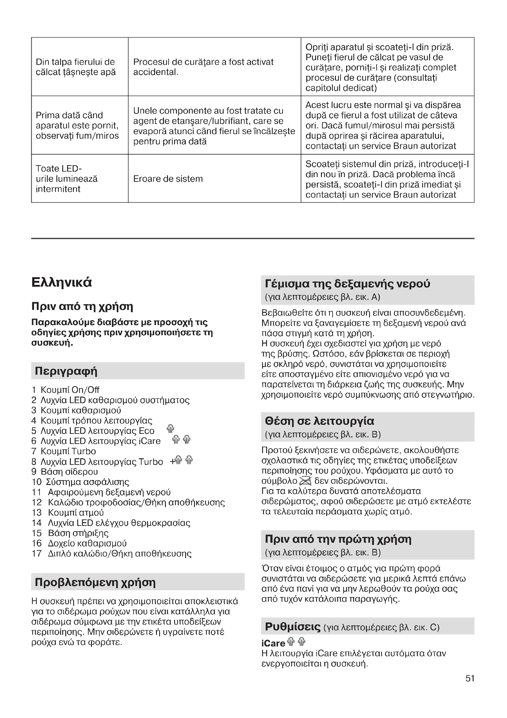 1 Κουμπί On/Off 2 Λυχνία LED καθαρισμού συστήματος 3 Κουμπί καθαρισμού 4 Κουμπί τρόπου λειτουργίας 5 Λυχνία LED λειτουργίας Eco 6 Λυχνία LED λειτουργίας iCare 7 Κουμπί Turbo 8 Λυχνία LED λειτουργίας Turbo + 9 Βάση σίδερου 10 Σύστημα ασφάλισης 11 Αφαιρούμενη δεξαμενή νερού 12 Καλώδιο τροφοδοσίας/Θήκη αποθήκευσης 13 Κουμπί ατμού 14 Λυχνία LED ελέγχου θερμοκρασίας 15 Βάση στήριξης 16 Δοχείο καθαρισμού 17 Διπλό καλώδιο/Θήκη αποθήκευσης Προβλεπόμενη χρήση Η συσκευή πρέπει να χρησιμοποιείται αποκλειστικά για το σιδέρωμα ρούχων που είναι κατάλληλα για σιδέρωμα σύμφωνα με την ετικέτα υποδείξεων περιποίησης. Μην σιδερώνετε ή υγραίνετε ποτέ ρούχα ενώ τα φοράτε. Γέμισμα της δεξαμενής νερού (για λεπτομέρειες βλ. εικ. A) Βεβαιωθείτε ότι η συσκευή είναι αποσυνδεδεμένη. Μπορείτε να ξαναγεμίσετε τη δεξαμενή νερού ανά πάσα στιγμή κατά τη χρήση. Η συσκευή έχει σχεδιαστεί για χρήση με νερό της βρύσης. Ωστόσο, εάν βρίσκεται σε περιοχή με σκληρό νερό, συνιστάται να χρησιμοποιείτε είτε αποσταγμένο είτε απιονισμένο νερό για να παρατείνεται τη διάρκεια ζωής της συσκευής. Μην χρησιμοποιείτε νερό συμπύκνωσης από στεγνωτήριο. Θέση σε λειτουργία (για λεπτομέρειες βλ. εικ. B) Προτού ξεκινήσετε να σιδερώνετε, ακολουθήστε σχολαστικά τις οδηγίες της ετικέτας υποδείξεων περιποίησης του ρούχου. Υφάσματα με αυτό το
