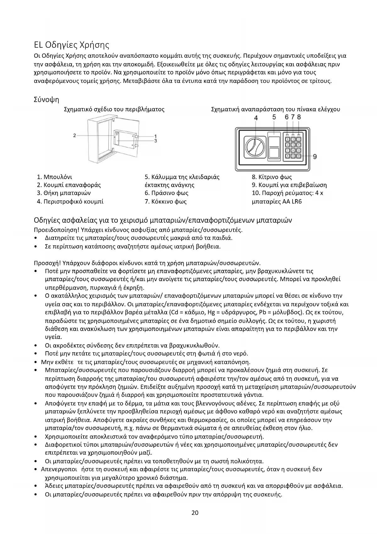 - Είστε νομικά υποχρεωμένοι να απορρίπτετε τις μπαταρίες στον αντιπρόσωπό σας ή στα σημεία συλλογής που προβλέπονται από την αρμόδια αρχή διάθεσης αποβλήτων. Περιεχόμενο συσκευασίας Ελέγξτε το περιεχόμενο της συσκευασίας του χρηματοκιβωτίου πριν χρησιμοποιήσετε το χρηματοκιβώτιο. Αν κάτι λείπει ή έχει υποστεί ζημιά, απευθυνθείτε στο σέρβις μας. 1x χρηματοκιβώτιο 2x κλειδί έκτακτης ανάγκης 1 Oδηγίες Xρήσης