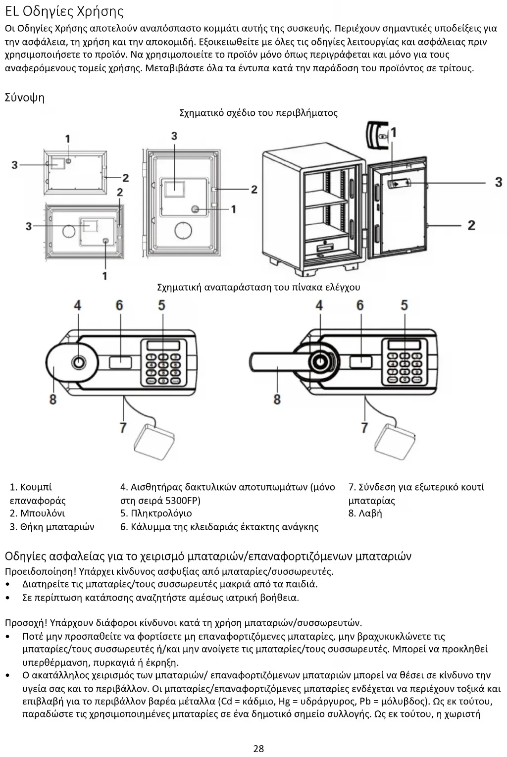- Είστε νομικά υποχρεωμένοι να απορρίπτετε τις μπαταρίες στον αντιπρόσωπό σας ή στα σημεία συλλογής που προβλέπονται από την αρμόδια αρχή δι άθεσης αποβλήτων. Περιεχόμενο συσκευασίας Ελέγξτε το περιεχόμενο της συσκευασίας του χρηματοκιβωτίου πριν χρησιμοποιήσετε το χρηματοκιβώτιο. Αν κάτι λείπει ή έχει υποστεί ζημιά, απευθυνθείτε στο σέρβις μας.