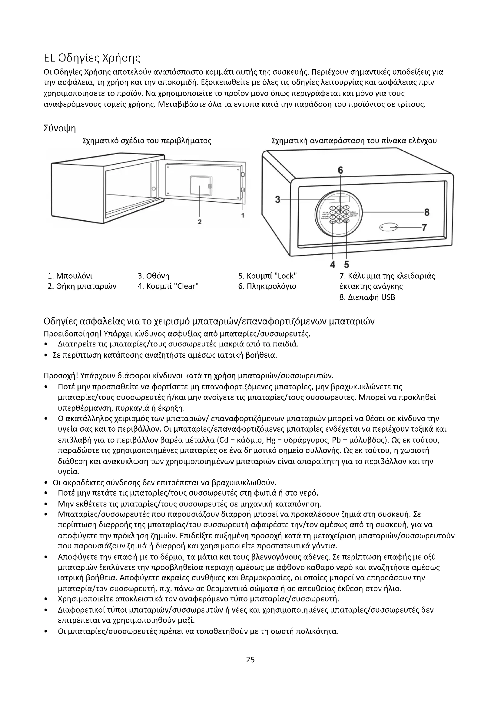 - Είστε νομικά υποχρεωμένοι να απορρίπτετε τις μπαταρίες στον αντιπρόσωπό σας ή στα σημεία συλλογής που προβλέπονται από την αρμόδια αρχή διάθεσης αποβλήτων. Περιεχόμενο συσκευασίας Ελέγξτε το περιεχόμενο της συσκευασίας του χρηματοκιβωτίου πριν χρησιμοποιήσετε το χρηματοκιβώτιο. Αν κάτι λείπει ή έχει υποστεί ζημιά, απευθυνθείτε στο σέρβις μας.