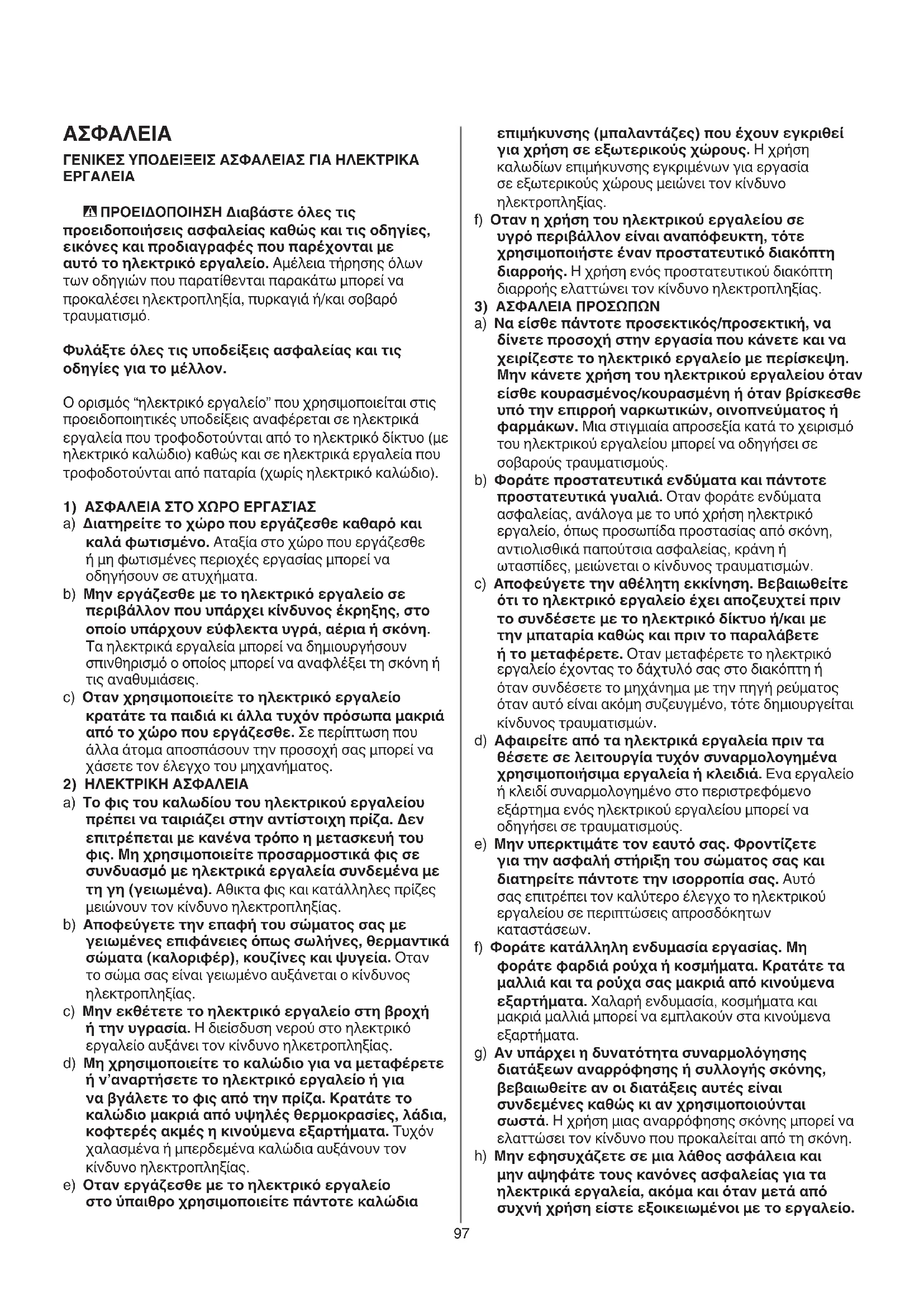 a) To φις του καλωδίου του ηλεκτρικού εργαλείου πρέπει να ταιριάζει στην αντίστοιχη πρίζα. Δεν επιτρέπεται με κανένα τρόπο η μετασκευή του φις. Μη χρησιμοποιείτε προσαρμοστικά φις σε συνδυασμό με ηλεκτρικά εργαλεία συνδεμένα με τη γη (γειωμένα). Αθικτα φις και κατάλληλες πρίζες μειώνουν τον κίνδυνο ηλεκτροπληξίας. b) Αποφεύγετε την επαφή του σώματος σας με γειωμένες επιφάνειες όπως σωλήνες, θερμαντικά σώματα (καλοριφέρ), κουζίνες και ψυγεία. Οταν το σώμα σας είναι γειωμένο αυξάνεται ο κίνδυνος ηλεκτροπληξίας. c) Μην εκθέτετε το ηλεκτρικό εργαλείο στη βροχή ή την υγρασία. Η διείσδυση νερού στο ηλεκτρικό εργαλείο αυξάνει τον κίνδυνο ηλκετροπληξίας. d) Μη χρησιμοποιείτε το καλώδιο για να μεταφέρετε ή ν’αναρτήσετε το ηλεκτρικό εργαλείο ή για να βγάλετε το φις από την πρίζα. Κρατάτε το καλώδιο μακριά από υψηλές θερμοκρασίες, λάδια, κοφτερές ακμές η κινούμενα εξαρτήματα. Τυχόν χαλασμένα ή μπερδεμένα καλώδια αυξάνουν τον κίνδυνο ηλεκτροπληξίας. e) Οταν εργάζεσθε με το ηλεκτρικό εργαλείο στο ύπαιθρο χρησιμοποιείτε πάντοτε καλώδια98