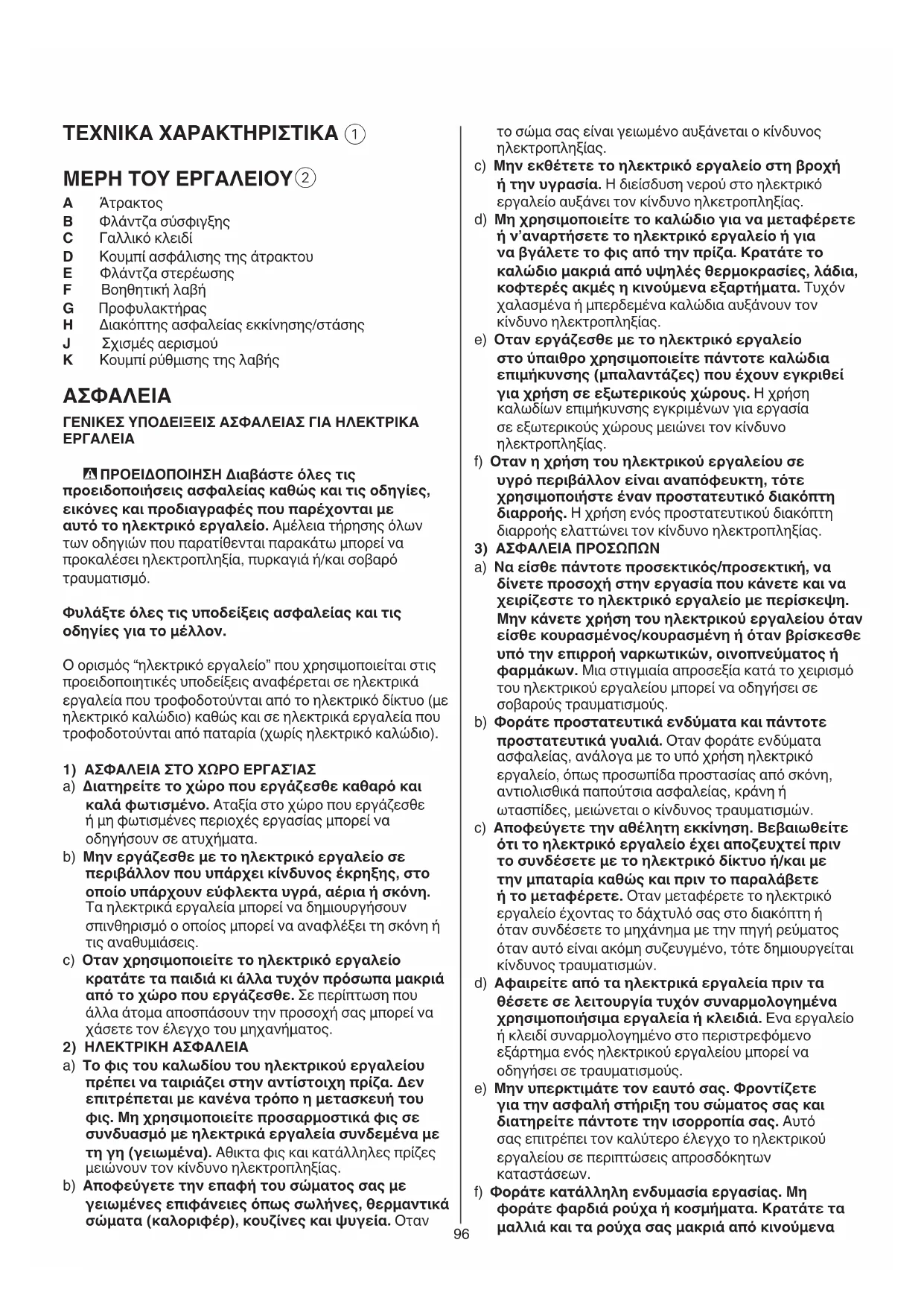 - ΠΡΟΕΙΔΟΠΟΙΗΣΗ Διαβάστε όλες τις προειδοποιήσεις ασφαλείας καθώς και τις οδηγίες, εικόνες και προδιαγραφές που παρέχονται με αυτό το ηλεκτρικό εργαλείο. Αμέλεια τήρησης όλων των οδηγιών που παρατίθενται παρακάτω μπορεί να προκαλέσει ηλεκτροπληξία, πυρκαγιά ή/και σοβαρό τραυματισμό. Φυλάξτε όλες τις υποδείξεις ασφαλείας και τις οδηγίες για το μέλλον. Ο ορισμός “ηλεκτρικό εργαλείο” που χρησιμοποιείται στις προειδοποιητικές υποδείξεις αναφέρεται σε ηλεκτρικά εργαλεία που τροφοδοτούνται από το ηλεκτρικό δίκτυο (με ηλεκτρικό καλώδιο) καθώς και σε ηλεκτρικά εργαλεία που τροφοδοτούνται από παταρία (χωρίς ηλεκτρικό καλώδιο).