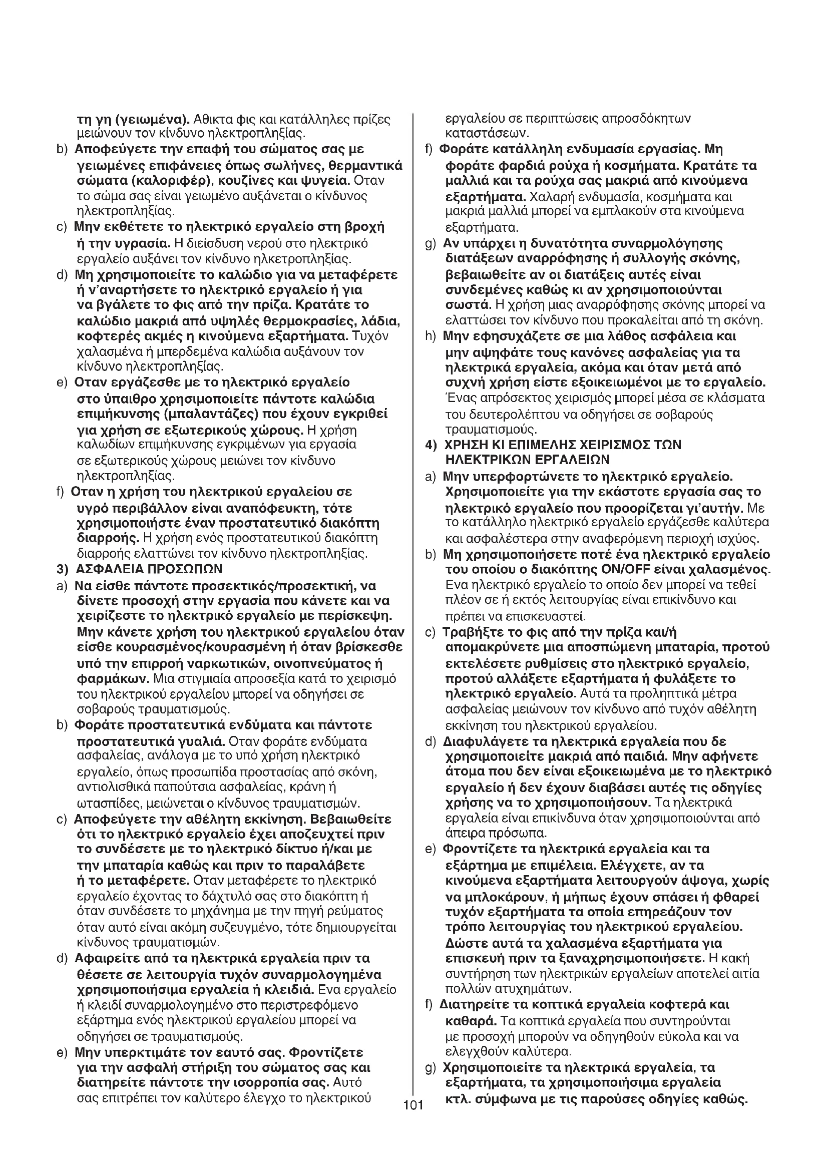 a) Μην υπερφορτώνετε το ηλεκτρικό εργαλείο. Xρησιμοποιείτε για την εκάστοτε εργασία σας το ηλεκτρικό εργαλείο που προορίζεται γι’αυτήν. Με το κατάλληλο ηλεκτρικό εργαλείο εργάζεσθε καλύτερα και ασφαλέστερα στην αναφερόμενη περιοχή ισχύος. b) Μη χρησιμοποιήσετε ποτέ ένα ηλεκτρικό εργαλείο του οποίου ο διακόπτης ON/OFF είναι χαλασμένος. Eνα ηλεκτρικό εργαλείο το οποίο δεν μπορεί να τεθεί πλέον σε ή εκτός λειτουργίας είναι επικίνδυνο και πρέπει να επισκευαστεί. c) Τραβήξτε το φις από την πρίζα και/ή απομακρύνετε μια αποσπώμενη μπαταρία, προτού εκτελέσετε ρυθμίσεις στο ηλεκτρικό εργαλείο, προτού αλλάξετε εξαρτήματα ή φυλάξετε το ηλεκτρικό εργαλείο. Αυτά τα προληπτικά μέτρα ασφαλείας μειώνουν τον κίνδυνο από τυχόν αθέλητη εκκίνηση του ηλεκτρικού εργαλείου. d) Διαφυλάγετε τα ηλεκτρικά εργαλεία που δε χρησιμοποιείτε μακριά από παιδιά. Μην αφήνετε άτομα που δεν είναι εξοικειωμένα με το ηλεκτρικό εργαλείο ή δεν έχουν διαβάσει αυτές τις οδηγίες χρήσης να το χρησιμοποιήσουν. Τα ηλεκτρικά εργαλεία είναι επικίνδυνα όταν χρησιμοποιούνται από άπειρα πρόσωπα. e) Φροντίζετε τα ηλεκτρικά εργαλεία και τα εξάρτημα με επιμέλεια. Ελέγχετε, αν τα κινούμενα εξαρτήματα λειτουργούν άψογα, χωρίς να μπλοκάρουν, ή μήπως έχουν σπάσει ή φθαρεί τυχόν εξαρτήματα τα οποία επηρεάζουν τον τρόπο λειτουργίας του ηλεκτρικού εργαλείου. Δώστε αυτά τα χαλασμένα εξαρτήματα για επισκευή πριν τα ξαναχρησιμοποιήσετε. Η κακή συντήρηση των ηλεκτρικών εργαλείων αποτελεί αιτία πολλών ατυχημάτων. f) Διατηρείτε τα κοπτικά εργαλεία κοφτερά και καθαρά. Τα κοπτικά εργαλεία που συντηρούνται με προσοχή μπορούν να οδηγηθούν εύκολα και να ελεγχθούν καλύτερα. g) Xρησιμοποιείτε τα ηλεκτρικά εργαλεία, τα εξαρτήματα, τα χρησιμοποιήσιμα εργαλεία κτλ. σύμφωνα με τις παρούσες οδηγίες καθώς. τη γη (γειωμένα). Αθικτα φις και κατάλληλες πρίζες μειώνουν τον κίνδυνο ηλεκτροπληξίας. b) Αποφεύγετε την επαφή του σώματος σας με γειωμένες επιφάνειες όπως σωλήνες, θερμαντικά σώματα (καλοριφέρ), κουζίνες και ψυγεία. Οταν το σώμα σας είναι γειωμένο αυξάνεται ο κίνδυνος ηλεκτροπληξίας. c) Μην εκθέτετε το ηλεκτρικό εργαλείο στη βροχή ή την υγρασία. Η διείσδυση νερού στο ηλεκτρικό εργαλείο αυξάνει τον κίνδυνο ηλκετροπληξίας. d) Μη χρησιμοποιείτε το καλώδιο για να μεταφέρετε ή ν’αναρτήσετε το ηλεκτρικό εργαλείο ή για να βγάλετε το φις από την πρίζα. Κρατάτε το καλώδιο μακριά από υψηλές θερμοκρασίες, λάδια, κοφτερές ακμές η κινούμενα εξαρτήματα. Τυχόν χαλασμένα ή μπερδεμένα καλώδια αυξάνουν τον κίνδυνο ηλεκτροπληξίας. e) Οταν εργάζεσθε με το ηλεκτρικό εργαλείο στο ύπαιθρο χρησιμοποιείτε πάντοτε καλώδια επιμήκυνσης (μπαλαντάζες) που έχουν εγκριθεί για χρήση σε εξωτερικούς χώρους. Η χρήση καλωδίων επιμήκυνσης εγκριμένων για εργασία σε εξωτερικούς χώρους μειώνει τον κίνδυνο ηλεκτροπληξίας. f) Οταν η χρήση του ηλεκτρικού εργαλείου σε υγρό περιβάλλον είναι αναπόφευκτη, τότε χρησιμοποιήστε έναν προστατευτικό διακόπτη διαρροής. Η χρήση ενός προστατευτικού διακόπτη διαρροής ελαττώνει τον κίνδυνο ηλεκτροπληξίας.