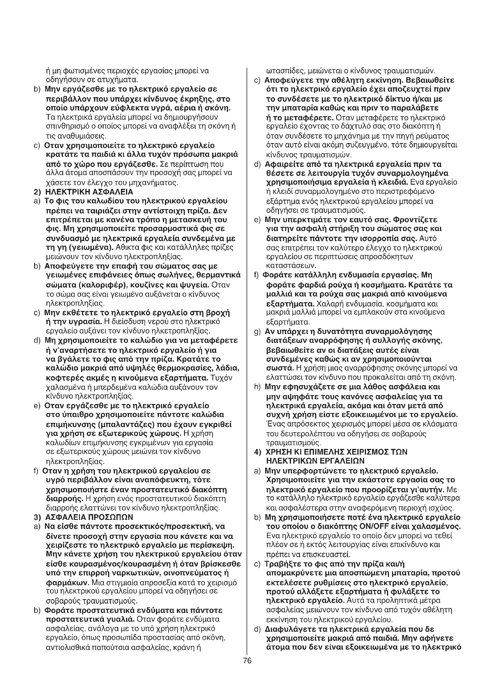 a) Μην υπερφορτώνετε το ηλεκτρικό εργαλείο. Xρησιμοποιείτε για την εκάστοτε εργασία σας το ηλεκτρικό εργαλείο που προορίζεται γι’αυτήν. Με το κατάλληλο ηλεκτρικό εργαλείο εργάζεσθε καλύτερα και ασφαλέστερα στην αναφερόμενη περιοχή ισχύος. b) Μη χρησιμοποιήσετε ποτέ ένα ηλεκτρικό εργαλείο του οποίου ο διακόπτης ON/OFF είναι χαλασμένος. Eνα ηλεκτρικό εργαλείο το οποίο δεν μπορεί να τεθεί πλέον σε ή εκτός λειτουργίας είναι επικίνδυνο και πρέπει να επισκευαστεί. c) Τραβήξτε το φις από την πρίζα και/ή απομακρύνετε μια αποσπώμενη μπαταρία, προτού εκτελέσετε ρυθμίσεις στο ηλεκτρικό εργαλείο, προτού αλλάξετε εξαρτήματα ή φυλάξετε το ηλεκτρικό εργαλείο. Αυτά τα προληπτικά μέτρα ασφαλείας μειώνουν τον κίνδυνο από τυχόν αθέλητη εκκίνηση του ηλεκτρικού εργαλείου. d) Διαφυλάγετε τα ηλεκτρικά εργαλεία που δε χρησιμοποιείτε μακριά από παιδιά. Μην αφήνετε άτομα που δεν είναι εξοικειωμένα με το ηλεκτρικό ή μη φωτισμένες περιοχές εργασίας μπορεί να οδηγήσουν σε ατυχήματα. b) Μην εργάζεσθε με το ηλεκτρικό εργαλείο σε περιβάλλον που υπάρχει κίνδυνος έκρηξης, στο οποίο υπάρχουν εύφλεκτα υγρά, αέρια ή σκόνη. Τα ηλεκτρικά εργαλεία μπορεί να δημιουργήσουν σπινθηρισμό ο οποίος μπορεί να αναφλέξει τη σκόνη ή τις αναθυμιάσεις. c) Οταν χρησιμοποιείτε το ηλεκτρικό εργαλείο κρατάτε τα παιδιά κι άλλα τυχόν πρόσωπα μακριά από το χώρο που εργάζεσθε. Σε περίπτωση που άλλα άτομα αποσπάσουν την προσοχή σας μπορεί να χάσετε τον έλεγχο του μηχανήματος.