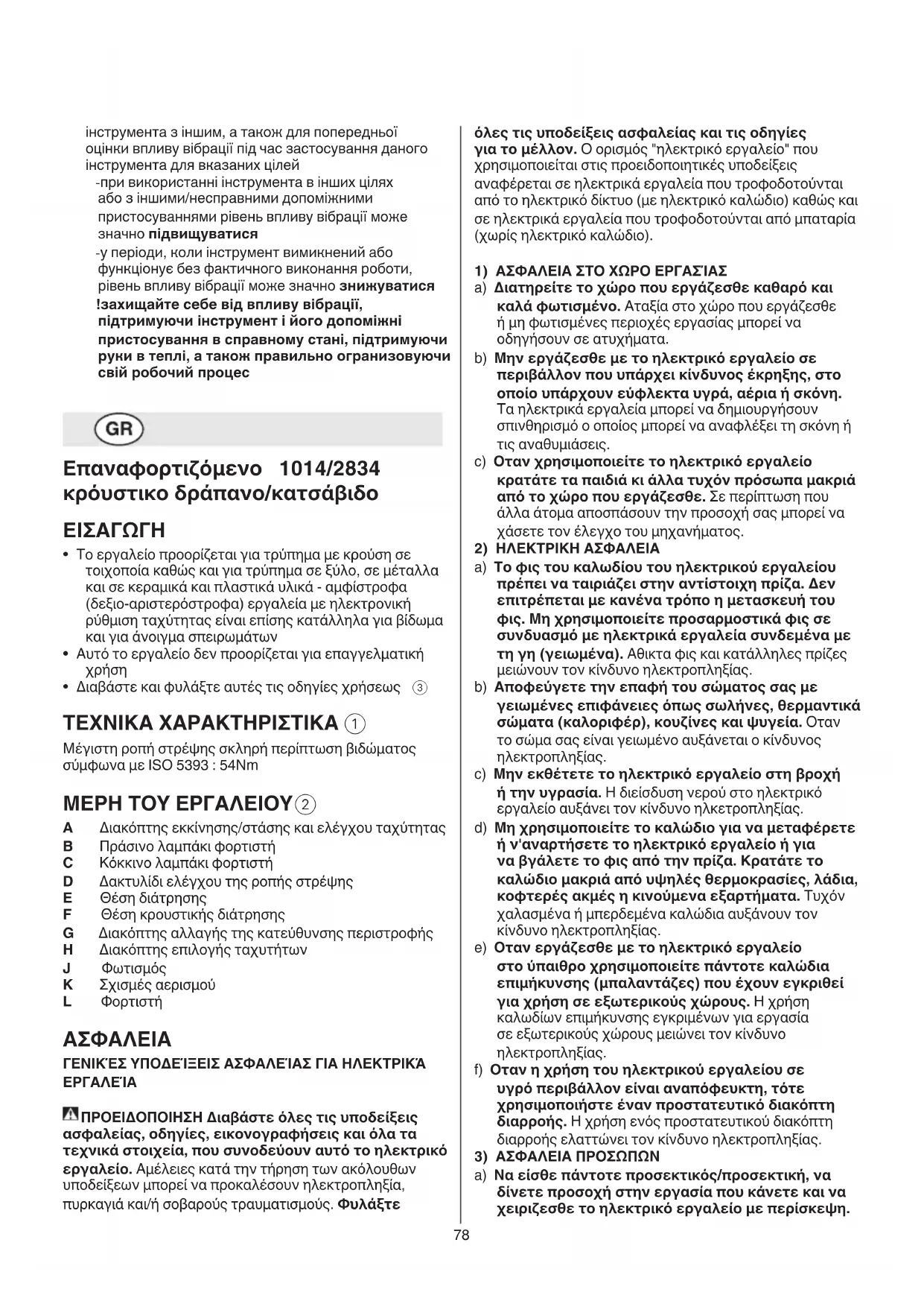 ΠΡΟEΙΔΟΠΟΙΗΣΗ Διαβάστε όλες τις υποδείξεις ασφαλείας, οδηγίες, εικονογραφήσεις και όλα τα τεχνικά στοιχεία, που συνοδεύουν αυτό το ηλεκτρικό εργαλείο. Αμέλειες κατά την τήρηση των ακόλουθων υποδείξεων μπορεί να προκαλέσουν ηλεκτροπληξία, πυρκαγιά και/ή σοβαρούς τραυματισμούς. Φυλάξτε79 πρέπει να επισκευαστεί. c) Τραβήξτε το φις από την πρίζα και/ή απομακρύνετε μια αποσπώμενη μπαταρία, προτού εκτελέσετε ρυθμίσεις στο ηλεκτρικό εργαλείο, προτού αλλάξετε εξαρτήματα ή φυλάξετε το ηλεκτρικό εργαλείο. Αυτά τα προληπτικά μέτρα ασφαλείας μειώνουν τον κίνδυνο από τυχόν αθέλητη εκκίνηση του ηλεκτρικού εργαλείου. d) Διαφυλάγετε τα ηλεκτρικά εργαλεία που δε χρησιμοποιείτε μακριά από παιδιά. Μην αφήνετε άτομα που δεν είναι εξοικειωμένα με το ηλεκτρικό εργαλείο ή δεν έχουν διαβάσει αυτές τις οδηγίες χρήσης να το χρησιμοποιήσουν. Τα ηλεκτρικά εργαλεία είναι επικίνδυνα όταν χρησιμοποιούνται από άπειρα πρόσωπα. e) Φροντίζετε τα ηλεκτρικά εργαλεία και τα εξάρτημα με επιμέλεια. Ελέγχετε, αν τα κινούμενα εξαρτήματα λειτουργούν άψογα, χωρίς να μπλοκάρουν, ή μήπως έχουν σπάσει ή φθαρεί τυχόν εξαρτήματα τα οποία επηρεάζουν τον τρόπο λειτουργίας του ηλεκτρικού εργαλείου. Δώστε αυτά τα χαλασμένα εξαρτήματα για επισκευή πριν τα ξαναχρησιμοποιήσετε. Η κακή συντήρηση των ηλεκτρικών εργαλείων αποτελεί αιτία πολλών ατυχημάτων. f) Διατηρείτε τα κοπτικά εργαλεία κοφτερά και καθαρά. Τα κοπτικά εργαλεία που συντηρούνται με προσοχή μπορούν να οδηγηθούν εύκολα και να ελεγχθούν καλύτερα. g) Xρησιμοποιείτε τα ηλεκτρικά εργαλεία, τα εξαρτήματα, τα χρησιμοποιήσιμα εργαλεία κτλ. σύμφωνα με τις παρούσες οδηγίες καθώς. Λαμβάνετε ταυτόχρονα υπόψην σας τις συνθήκες εργασίας και την υπό εκτέλεση εργασία. Η χρήση του ηλεκτρικού εργαλείου για άλλες εκτός από τις προβλεπόμενες εργασίες μπορεί να δημιουργήσει επικίνδυνες καταστάσεις. h) Διατηρείτε τις λαβές και επιφάνειες λαβής στεγνές, καθαρές και ελεύθερες από λάδι και γράσο. Οι ολισθηρές λαβές και επιφάνειες λαβής δεν επιτρέπουν κανέναν ασφαλή χειρισμό και έλεγχο του ηλεκτρικού εργαλείου σε τυχόν απρόβλεπτες καταστάσεις.