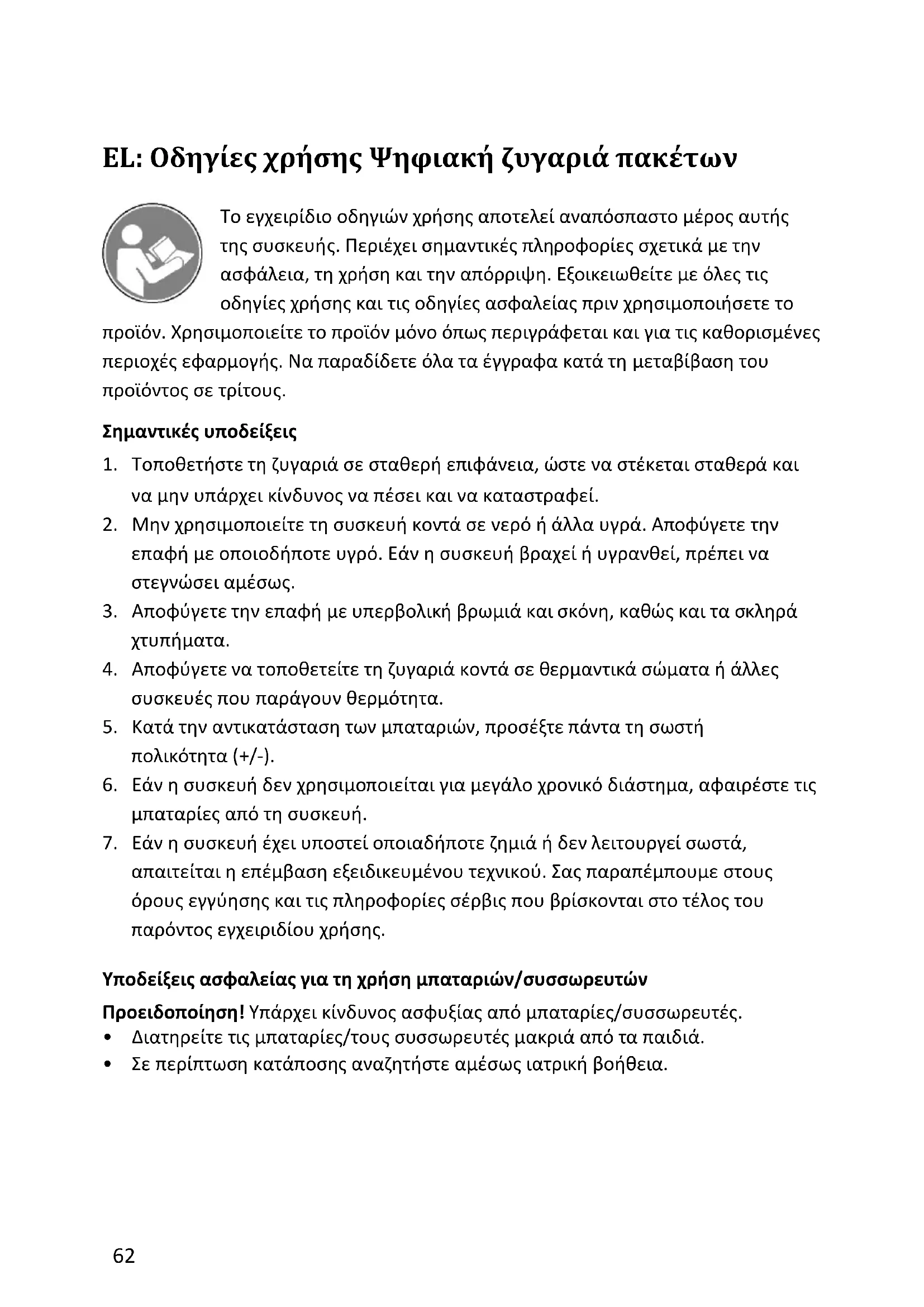 UK Authorised Representative (for authorities only) ProductIP (UK) Ltd. 8, Northumberland Av. London WC2N 5BY Fabrikant GO Europe GmbH Zum Kraftwerk 1 D-45527 Hattingen Duitsland www.go-europe.com service@go-europe.com62 EL: Οδηγίες χρήσης Ψηφιακή ζυγαριά πακέτων Το εγχειρίδιο οδηγιών χρήσης αποτελεί αναπόσπαστο μέρος αυτής της συσκευής. Περιέχει σημαντικές πληροφορίες σχετικά με την ασφάλεια, τη χρήση και την απόρριψη. Εξοικειωθείτε με όλες τις οδηγίες χρήσης και τις οδηγίες ασφαλείας πριν χρησιμοποιήσετε το προϊόν. Χρησιμοποιείτε το προϊόν μόνο όπως περιγράφεται και για τις καθορισμένες περιοχές εφαρμογής. Να παραδίδετε όλα τα έγγραφα κατά τη μεταβίβαση του προϊόντος σε τρίτους. Σημαντικές υποδείξεις