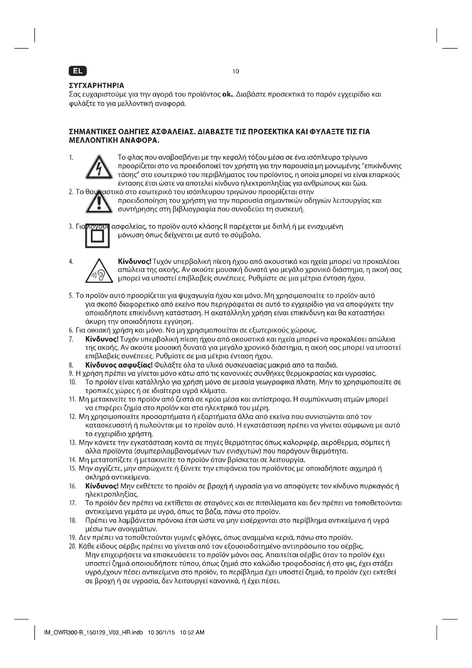 ΣΥΓΧΑΡΗΤΗΡΙΑ Σας ευχαριστούμε για την αγορά του προϊόντος ok.. Διαβάστε προσεκτικά το παρόν εγχειρίδιο και φυλάξτε το για μελλοντική αναφορά. ΣΗΜΑΝΤΙΚΕΣ ΟΗΓΙΕΣ ΑΣΦΑΛΕΙΑΣ. ΙΑΒΑΣΤΕ ΤΙΣ ΠΡΟΣΕΚΤΙΚΑ ΚΑΙ ΦΥΛΑΞΤΕ ΤΙΣ ΓΙΑ ΜΕΛΛΟΝΤΙΚΗ ΑΝΑΦΟΡΑ.