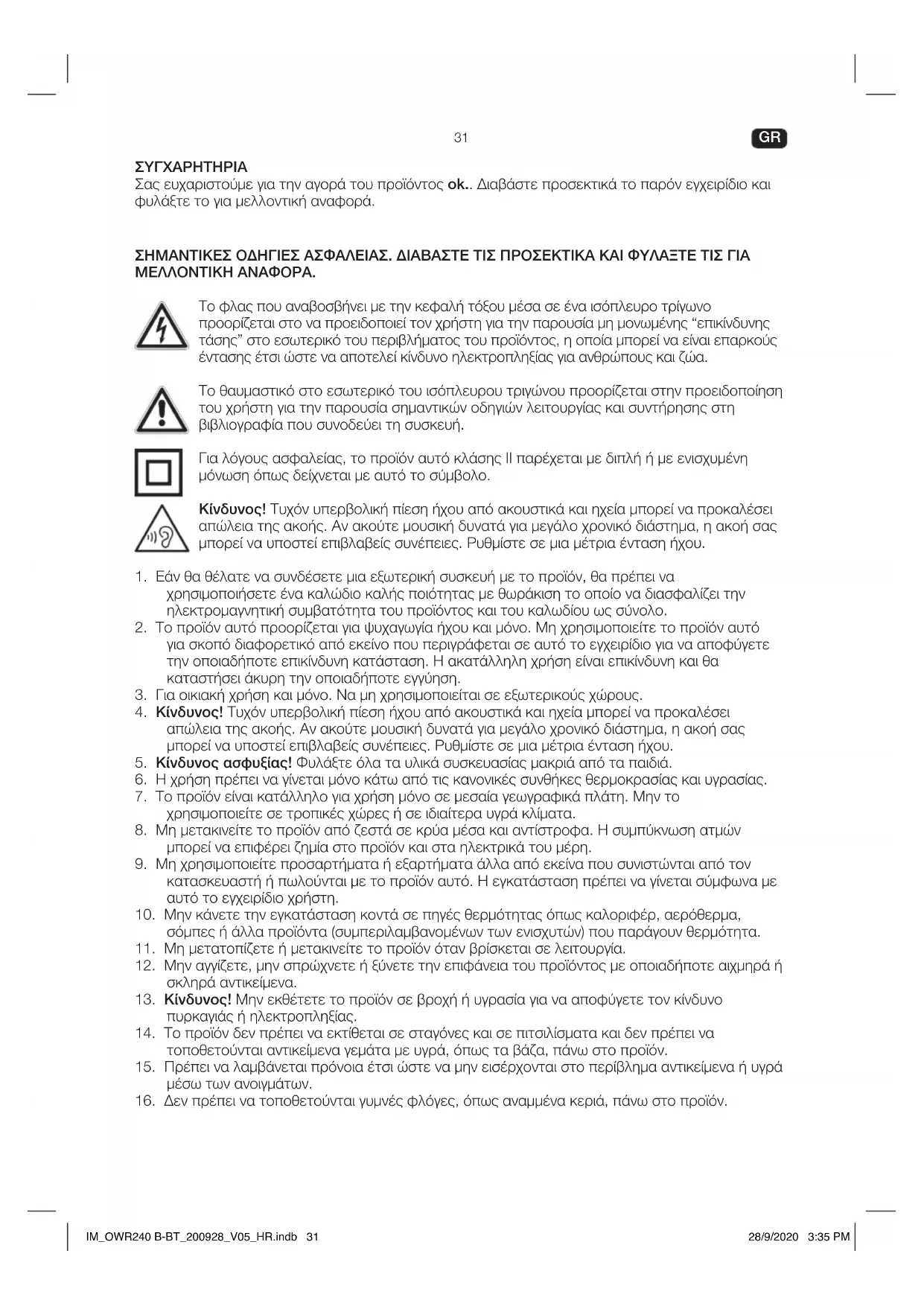 ΣΥΓΧΑΡΗΤΗΡΙΑ Σας ευχαριστούμε για την αγορά του προϊόντος ok.. Διαβάστε προσεκτικά το παρόν εγχειρίδιο και φυλάξτε το για μελλοντική αναφορά. ΣΗΜΑΝΤΙΚΕΣ ΟΔΗΓΙΕΣ ΑΣΦΑΛΕΙΑΣ. ΔΙΑΒΑΣΤΕ ΤΙΣ ΠΡΟΣΕΚΤΙΚΑ ΚΑΙ ΦΥΛΑΞΤΕ ΤΙΣ ΓΙΑ ΜΕΛΛΟΝΤΙΚΗ ΑΝΑΦΟΡΑ. Το φλας που αναβοσβήνει με την κεφαλή τόξου μέσα σε ένα ισόπλευρο τρίγωνο προορίζεται στο να προειδοποιεί τον χρήστη για την παρουσία μη μονωμένης “επικίνδυνης τάσης” στο εσωτερικό του περιβλήματος του προϊόντος, η οποία μπορεί να είναι επαρκούς έντασης έτσι ώστε να αποτελεί κίνδυνο ηλεκτροπληξίας για ανθρώπους και ζώα. Το θαυμαστικό στο εσωτερικό του ισόπλευρου τριγώνου προορίζεται στην προειδοποίηση του χρήστη για την παρουσία σημαντικών οδηγιών λειτουργίας και συντήρησης στη βιβλιογραφία που συνοδεύει τη συσκευή. Για λόγους ασφαλείας, το προϊόν αυτό κλάσης II παρέχεται με διπλή ή με ενισχυμένη μόνωση όπως δείχνεται με αυτό το σύμβολο. Κίνδυνος! Τυχόν υπερβολική πίεση ήχου από ακουστικά και ηχεία μπορεί να προκαλέσει απώλεια της ακοής. Αν ακούτε μουσική δυνατά για μεγάλο χρονικό διάστημα, η ακοή σας μπορεί να υποστεί επιβλαβείς συνέπειες. Ρυθμίστε σε μια μέτρια ένταση ήχου.