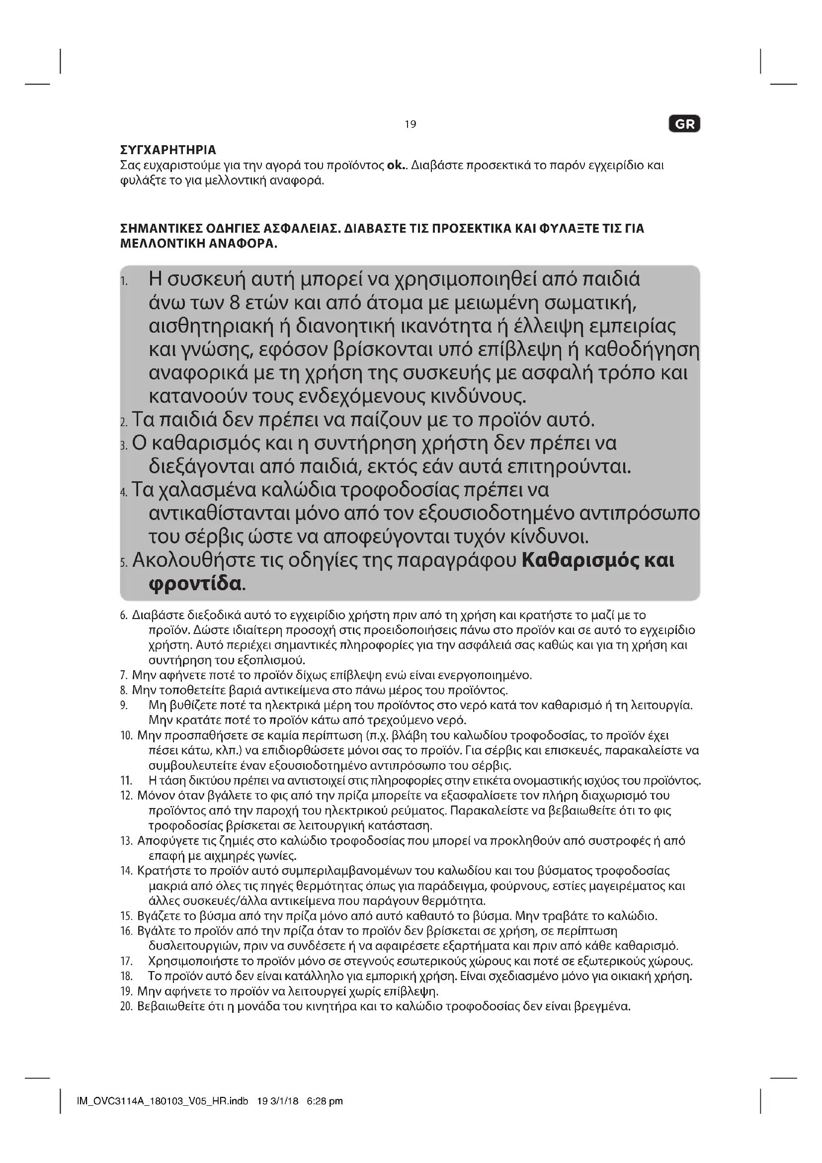 ΣΥΓΧΑΡΗΤΗΡΙΑ Σας ευχαριστούμε για την αγορά του προϊόντος ok.. Διαβάστε προσεκτικά το παρόν εγχειρίδιο και φυλάξτε το για μελλοντική αναφορά. ΣΗΜΑΝΤΙΚΕΣ ΟΗΓΙΕΣ ΑΣΦΑΛΕΙΑΣ. ΙΑΒΑΣΤΕ ΤΙΣ ΠΡΟΣΕΚΤΙΚΑ ΚΑΙ ΦΥΛΑΞΤΕ ΤΙΣ ΓΙΑ ΜΕΛΛΟΝΤΙΚΗ ΑΝΑΦΟΡΑ.
