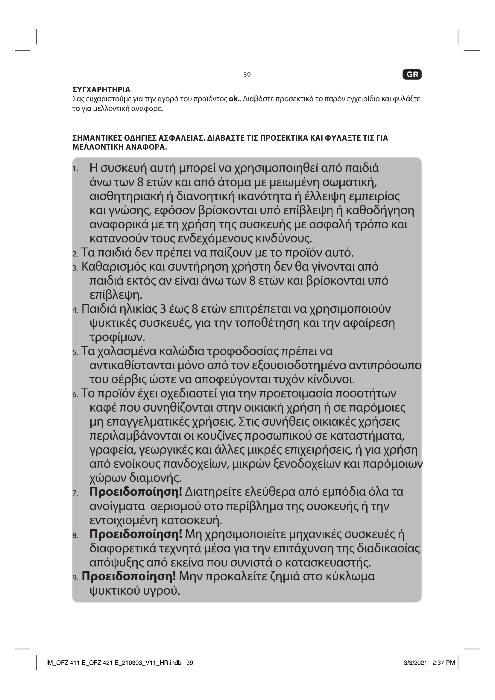 ΣΥΓΧΑΡΗΤΗΡΙΑ Σας ευχαριστούμε για την αγορά του προϊόντος ok.. Διαβάστε προσεκτικά το παρόν εγχειρίδιο και φυλάξτε το για μελλοντική αναφορά. ΣΗΜΑΝΤΙΚΕΣ ΟΔΗΓΙΕΣ ΑΣΦΑΛΕΙΑΣ. ΔΙΑΒΑΣΤΕ ΤΙΣ ΠΡΟΣΕΚΤΙΚΑ ΚΑΙ ΦΥΛΑΞΤΕ ΤΙΣ ΓΙΑ ΜΕΛΛΟΝΤΙΚΗ ΑΝΑΦΟΡΑ.
