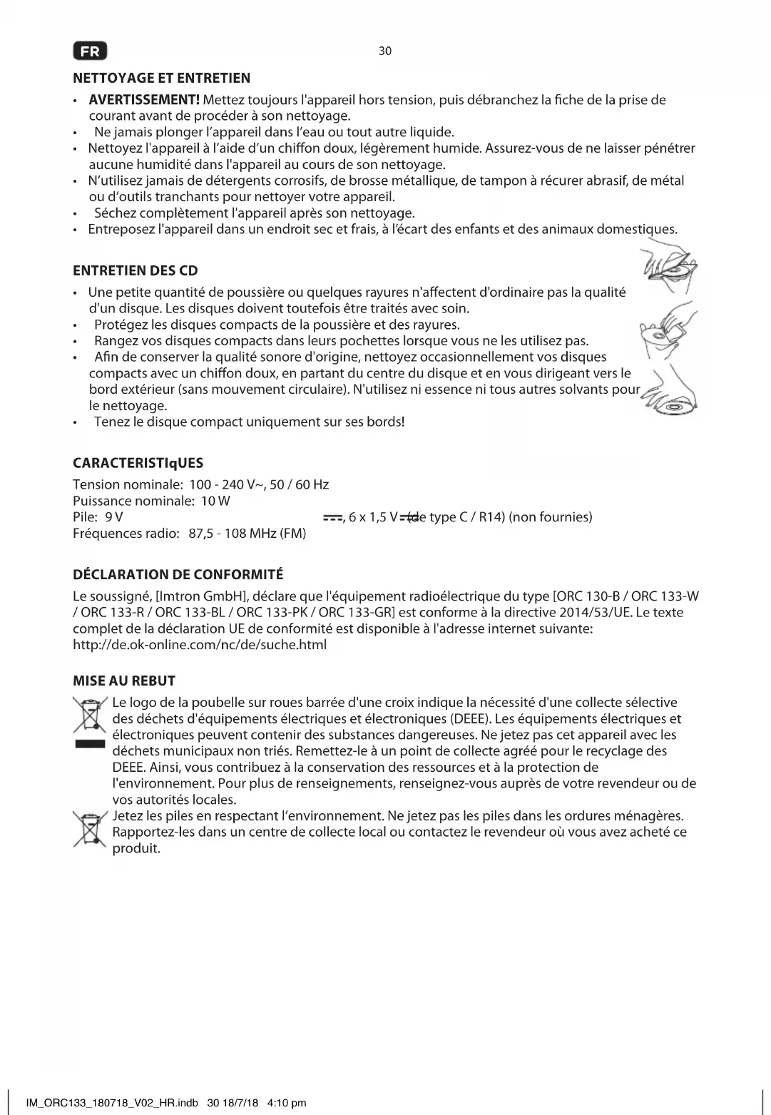 - Κρατήστε τα compact disc από τις άκρες! ΠΡΟΔΙΑΓΡΑΦΕΣ Ονομαστική τάση: 100 - 240 V~, 50 / 60 Hz Ονομαστική ισχύς: 10 W Μπαταρία: 9 V , 6 x 1,5 V (τύπου C / R14) (δεν περιλαμβάνονται) Ζώνη συχνοτήτων ραδιοφώνου: 87,5 - 108 MHz (FM) ΔΗΛΩΣΗ ΣΥΜΜΟΡΦΩΣΗΣ Με την παρούσα ο/η [Imtron GmbH], δηλώνει ότι ο ραδιοεξοπλισμός [ORC 130-B / ORC 133-W / ORC 133-R / ORC 133-BL / ORC 133-PK / ORC 133-GR] πληροί την οδηγία 2014/53/ΕΕ. Το πλήρες κείμενο της δήλωσης συμμόρφωσης ΕΕ διατίθεται στην ακόλουθη ιστοσελίδα στο διαδίκτυο: http://de.ok-online.com/nc/de/suche.html
