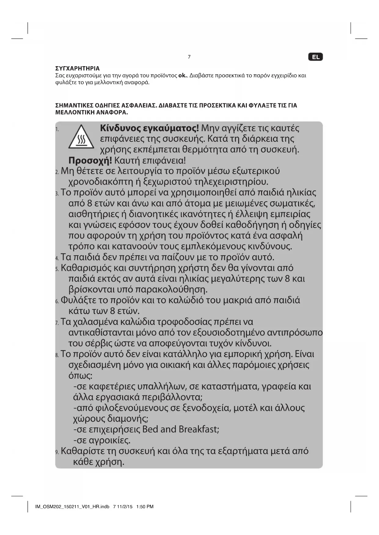 από το χερούλι της. ΠΡΟΤΙΘΕΜΕΝΗ ΧΡΗΣΗ TΗ συσκευή προορίζεται μόνο για προετοιμασία τροφίμων. Οποιαδήποτε άλλη χρήση ενδέχεται να προκαλέσει βλάβη στο προϊόν ή τραυματισμό. IM_OSM202_150211_V01_HR.indb 8 11/2/15 1:50 PM9