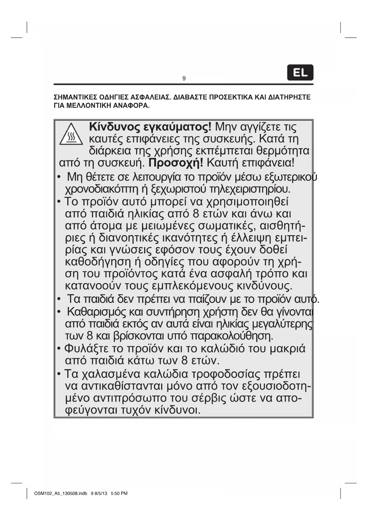 Μην πετάτε αυτή τη συσκευή μαζί με τα χύδην οικιακά απορρίμματα. Επιστρέψτε την σε ένα καθορισμένο σημείο περισυλλογής για την ανακύκλωση ηλεκτρικού και ηλεκτρονικού εξοπλισμού. Με αυτό τον τρόπο, συμβάλλετε στη διατήρηση των πόρων και την προστασία του περιβάλλοντος. Απευθυνθείτε στον αντιπρόσωπο της περιοχής σας ή στις αρμόδιες αρχές για περισσότερες πληροφορίες. OSM102_A5_130508.indb 14 8/5/13 5:50 PM15 Size - A5 IMPORTANT SAFETY INSTRUCTIONS. READ CAREFULLY AND KEEP FOR FUTURE REFERENCE. Risk of burning! Do not touch the product’s hot surfaces. Heat rises from the product during use. Caution! Hot surface!