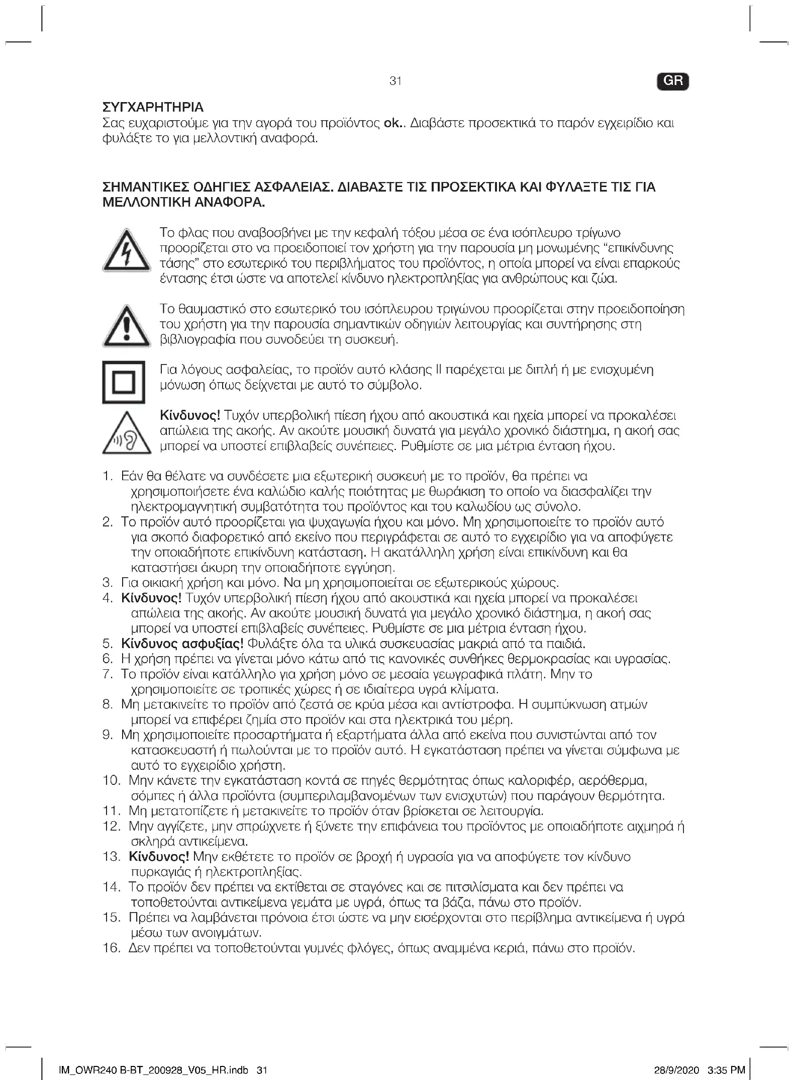 ΣΥΓΧΑΡΗΤΗΡΙΑ Σας ευχαριστούμε για την αγορά του προϊόντος ok.. Διαβάστε προσεκτικά το παρόν εγχειρίδιο και φυλάξτε το για μελλοντική αναφορά. ΣΗΜΑΝΤΙΚΕΣ ΟΔΗΓΙΕΣ ΑΣΦΑΛΕΙΑΣ. ΔΙΑΒΑΣΤΕ ΤΙΣ ΠΡΟΣΕΚΤΙΚΑ ΚΑΙ ΦΥΛΑΞΤΕ ΤΙΣ ΓΙΑ ΜΕΛΛΟΝΤΙΚΗ ΑΝΑΦΟΡΑ. Το φλας που αναβοσβήνει με την κεφαλή τόξου μέσα σε ένα ισόπλευρο τρίγωνο προορίζεται στο να προειδοποιεί τον χρήστη για την παρουσία μη μονωμένης “επικίνδυνης τάσης” στο εσωτερικό του περιβλήματος του προϊόντος, η οποία μπορεί να είναι επαρκούς έντασης έτσι ώστε να αποτελεί κίνδυνο ηλεκτροπληξίας για ανθρώπους και ζώα. Το θαυμαστικό στο εσωτερικό του ισόπλευρου τριγώνου προορίζεται στην προειδοποίηση του χρήστη για την παρουσία σημαντικών οδηγιών λειτουργίας και συντήρησης στη βιβλιογραφία που συνοδεύει τη συσκευή. Για λόγους ασφαλείας, το προϊόν αυτό κλάσης II παρέχεται με διπλή ή με ενισχυμένη μόνωση όπως δείχνεται με αυτό το σύμβολο. Κίνδυνος! Τυχόν υπερβολική πίεση ήχου από ακουστικά και ηχεία μπορεί να προκαλέσει απώλεια της ακοής. Αν ακούτε μουσική δυνατά για μεγάλο χρονικό διάστημα, η ακοή σας μπορεί να υποστεί επιβλαβείς συνέπειες. Ρυθμίστε σε μια μέτρια ένταση ήχου.
