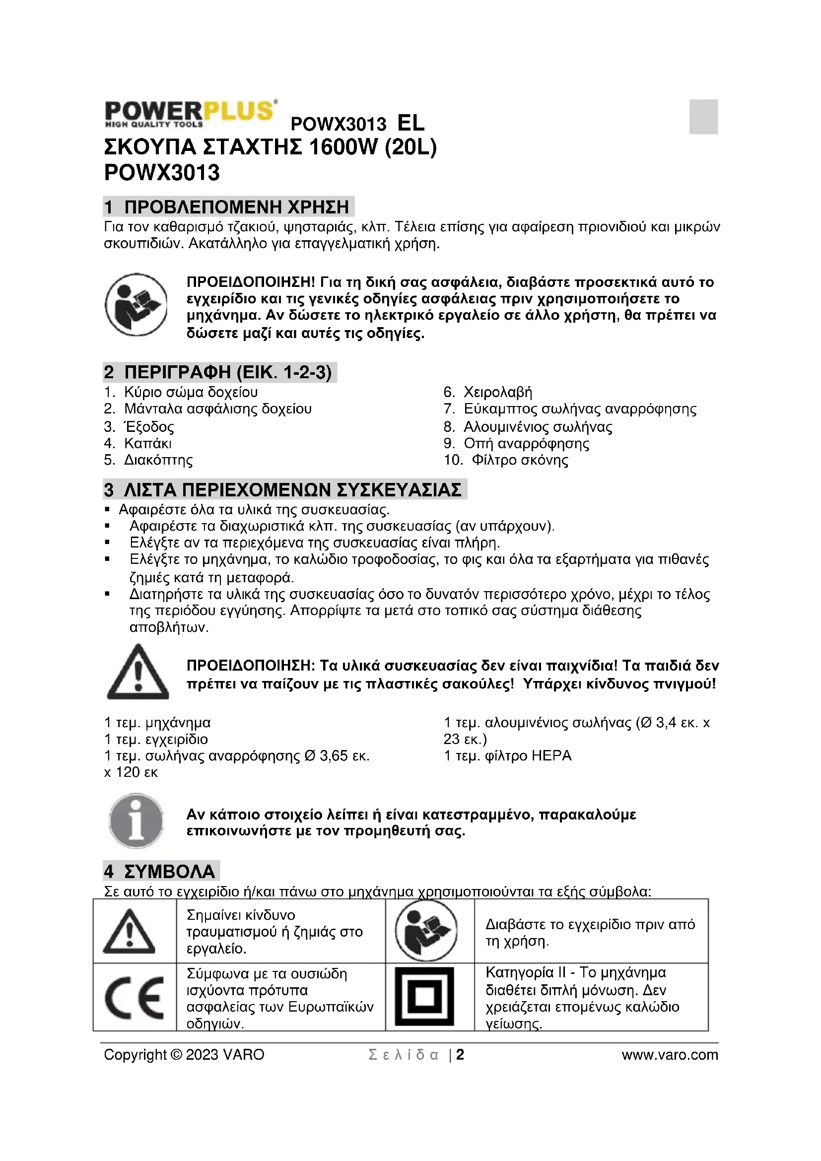 - 13 ΠΕΡΙΒΑΛΛΟΝ POWX3013 EL Copyright © 2023 VARO Σ ε λ ί δ α | 2 www.varo.com ΣΚΟΥΠΑ ΣΤΑΧΤΗΣ 1600W (20L) POWX3013 1 ΠΡΟΒΛΕΠΟΜΕΝΗ ΧΡΗΣΗ Για τον καθαρισμό τζακιού, ψησταριάς, κλπ. Τέλεια επίσης για αφαίρεση πριονιδιού και μικρών σκουπιδιών. Ακατάλληλο για επαγγελματική χρήση. ΠΡΟΕΙΔΟΠΟΙΗΣΗ! Για τη δική σας ασφάλεια, διαβάστε προσεκτικά αυτό το εγχειρίδιο και τις γενικές οδηγίες ασφάλειας πριν χρησιμοποιήσετε το μηχάνημα. Αν δώσετε το ηλεκτρικό εργαλείο σε άλλο χρήστη, θα πρέπει να δώσετε μαζί και αυτές τις οδηγίες. 2 ΠΕΡΙΓΡΑΦΗ (ΕΙΚ. 1-2-3) p. 7