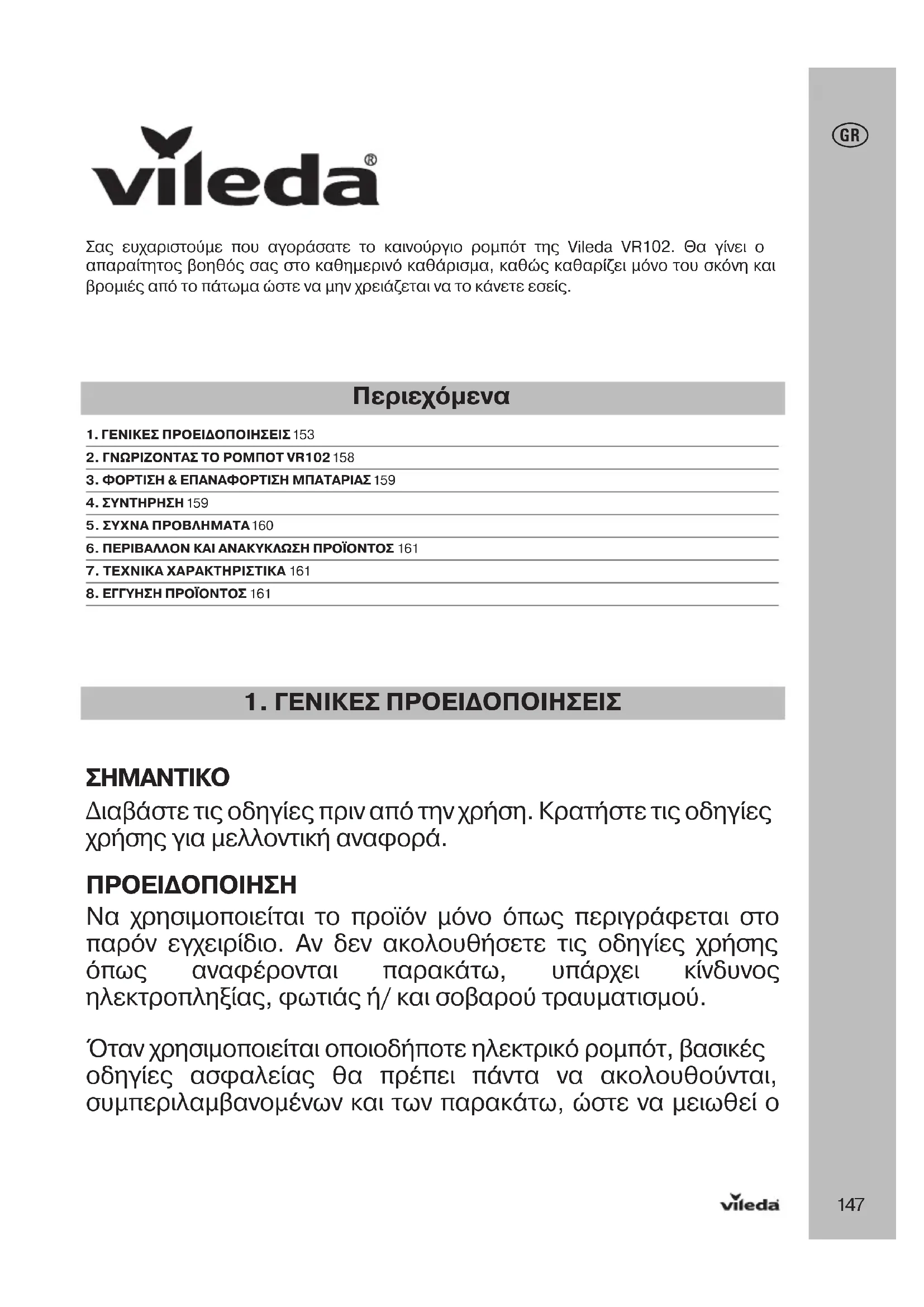 Διαβάστε τις οδηγίες πριν από την χρήση. Κρατήστε τις οδηγίες χρήσης για μελλοντική αναφορά. ΠΡΟΕΙΔΟΠΟΙΉΣΉ Να χρησιμοποιείται το προϊόν μόνο όπως περιγράφεται στο παρόν εγχειρίδιο. Αν δεν ακολουθήσετε τις οδηγίες χρήσης όπως αναφέρονται παρακάτω, υπάρχει κίνδυνος ηλεκτροπληξίας, φωτιάς ή/ και σοβαρού τραυματισμού. Όταν χρησιμοποιείται οποιοδήποτε ηλεκτρικό ρομπότ, βασικές οδηγίες ασφαλείας θα πρέπει πάντα να ακολουθούνται, συμπεριλαμβανομένων και των παρακάτω, ώστε να μειωθεί ο Σας ευχαριστούμε που αγοράσατε το καινούργιο ρομπότ της Vileda VR102. Θα γίνει ο απαραίτητος βοηθός σας στο καθημερινό καθάρισμα, καθώς καθαρίζει μόνο του σκόνη και βρομιές από το πάτωμα ώστε να μην χρειάζεται να το κάνετε εσείς. Περιεχόμενα 1. ΓΕΝΙΚΕΣ ΠΡΟΕΙΔΟΠΟΙΉΣΕΙΣ 15 32. ΓΝΩΡΙΖΟΝΤΑΣ ΤΟ ΡΟΜΠΟΤ VR102 15 83. ΦΟΡΤΙΣΉ & ΕΠΑΝΑΦΟΡΤΙΣΉ ΜΠΑΤΑΡΙΑΣ 15 94. ΣΥΝΤΉΡΉΣΉ 15 95. ΣΥΧΝΑ ΠΡΟΒΛΉΜΑΤΑ 16 06. ΠΕΡΙΒΑΛΛΟΝ ΚΑΙ ΑΝΑΚΥΚΛΩΣΉ ΠΡΟΪΟΝΤΟΣ 1617. ΤΕΧΝΙΚΑ ΧΑΡΑΚΤΉΡΙΣΤΙΚΑ 1618. ΕΓΓΥΉΣΉ ΠΡΟΪΟΝΤΟΣ 161148