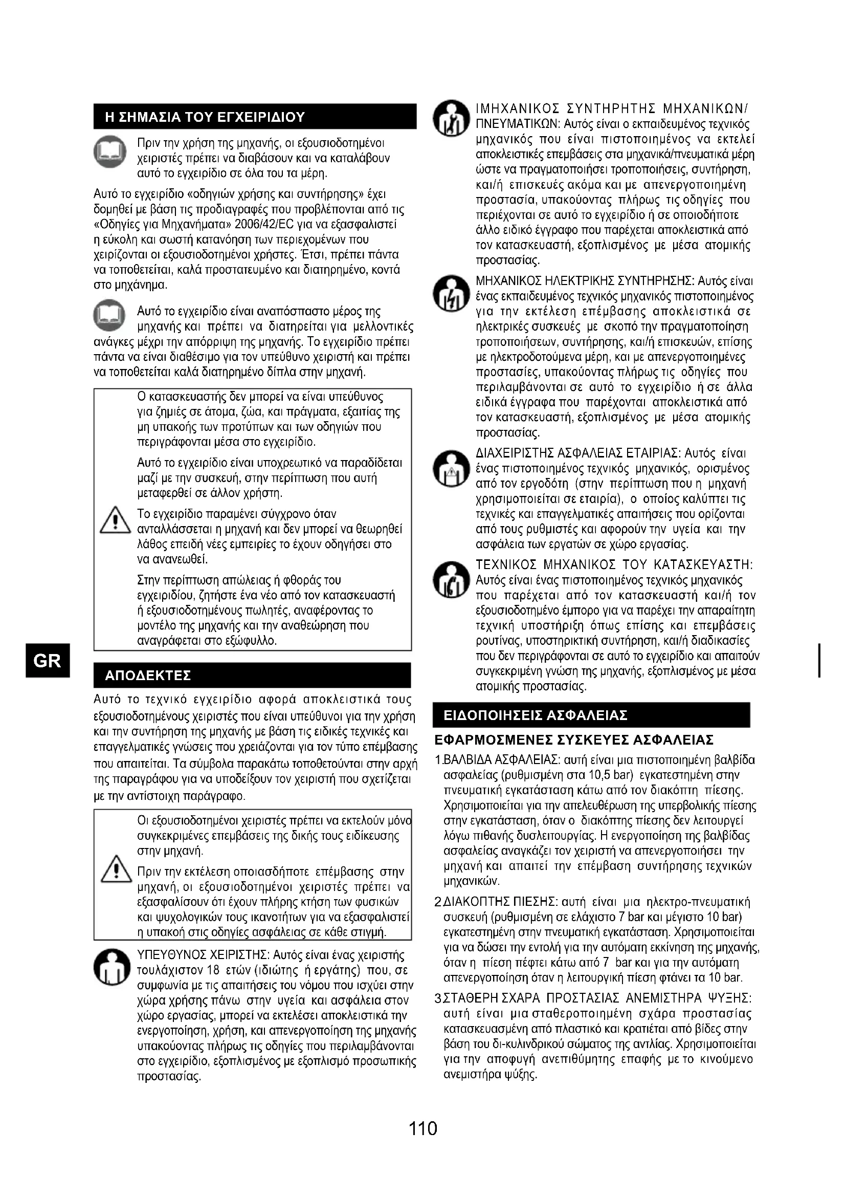ΌΡΙΑ ΧΡΗΣΗΣ Αυτή η μηχανή έχει σχεδιαστεί και παραχθεί αποκλειστικά για την προβλεπόμενη χρήση που περιγράφεται στην παρ. 9, και οποιαδήποτε άλλη χρήση και λειτουργία είναι ως εκ τούτου απολύτως απαγορευμένη ώστε να εξασφαλιστεί κάθε στιγμή η ασφάλεια των υπεύθυνων χειριστών, όπως επίσης και η αποδοτικότητα της ίδιας της μηχανής. Περιορισμοί χρήσης: απαγορεύεται αυστηρά η χρήση της μηχανής για λάθος χρήση, διαφορετική από την προβλεπόμενη. Είναι υποχρεωτικό να κρατάτε την μηχανή μακριά από παιδιά. Κατά την διάρκεια της χρήσης, είναι υποχρεωτικό να προσέχετε ώστε μη-εξουσιοδοτημένα άτομα να μην πλησιάζουν την μηχανή. Απαγορεύεται αυστηρά η χρήση σωλήνων αέρα (επεκτάσεις), εξοπλισμού, και εργαλείων που δεν είναι κατάλληλα και/ή δεν πληρούν τις οδηγίες σε