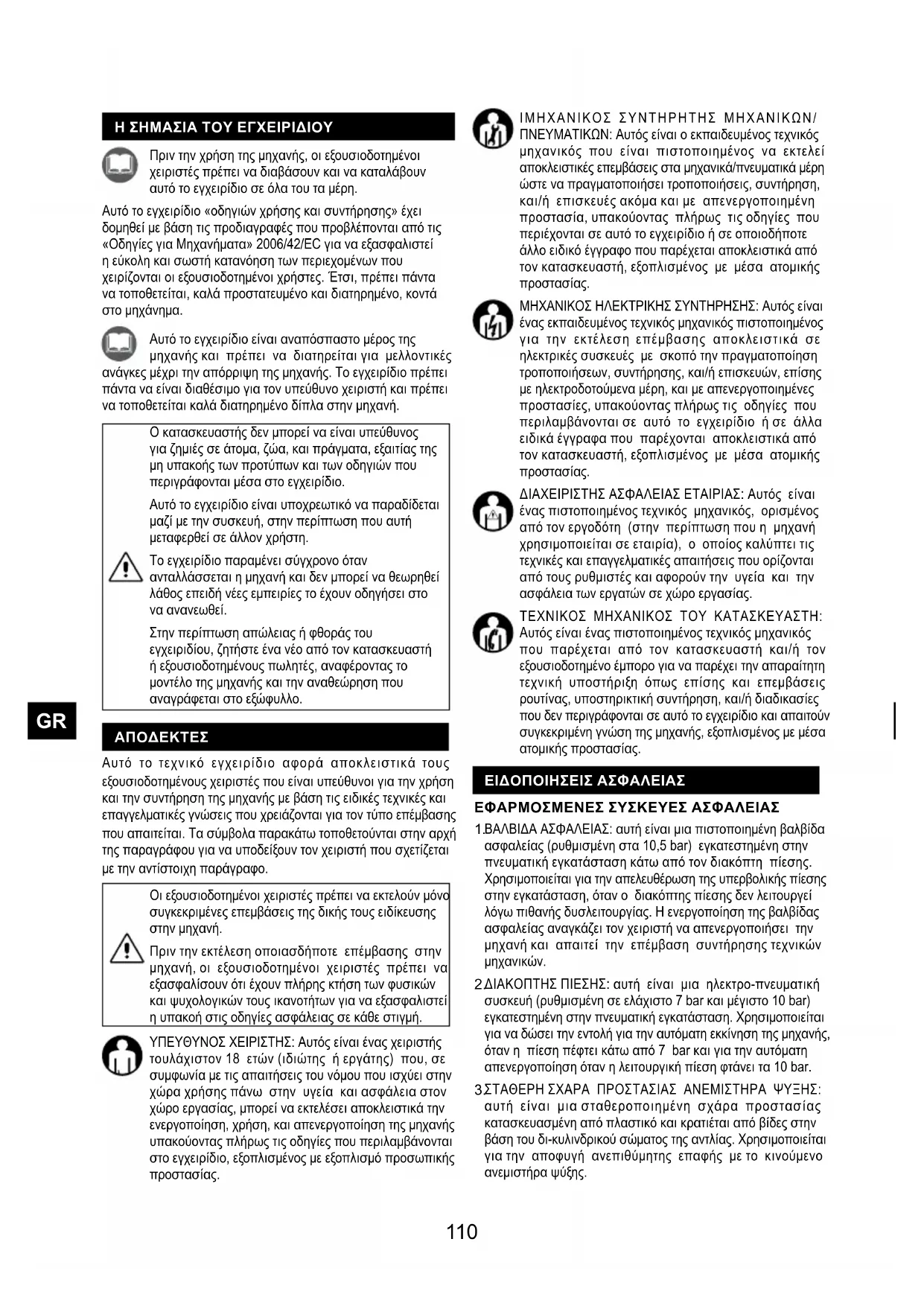 - ΕΓΓΥΗΣΗ IΜΗΧΑΝΙΚΟΣ ΣΥΝΤΗΡΗΤΗΣ ΜΗΧΑΝΙΚΩΝ/ ΠΝΕΥΜΑΤΙΚΩΝ: Αυτός είναι ο εκπαιδευμένος τεχνικός μηχανικός που είναι πιστοποιημένος να εκτελεί αποκλειστικές επεμβάσεις στα μηχανικά/πνευματικά μέρη ώστε να πραγματοποιήσει τροποποιήσεις, συντήρηση, και/ή επισκευές ακόμα και με απενεργοποιημένη προστασία, υπακούοντας πλήρως τις οδηγίες που περιέχονται σε αυτό το εγχειρίδιο ή σε οποιοδήποτε άλλο ειδικό έγγραφο που παρέχεται αποκλειστικά από τον κατασκευαστή, εξοπλισμένος με μέσα ατομικής προστασίας. ΜΗΧΑΝΙΚΟΣ ΗΛΕΚΤΡΙΚΗΣ ΣΥΝΤΗΡΗΣΗΣ: Αυτός είναι ένας εκπαιδευμένος τεχνικός μηχανικός πιστοποιημένος για την εκτέλεση επέμβασης αποκλειστικά σε ηλεκτρικές συσκευές με σκοπό την πραγματοποίηση τροποποιήσεων, συντήρησης, και/ή επισκευών, επίσης με ηλεκτροδοτούμενα μέρη, και με απενεργοποιημένες προστασίες, υπακούοντας πλήρως τις οδηγίες που περιλαμβάνονται σε αυτό το εγχειρίδιο ή σε άλλα ειδικά έγγραφα που παρέχονται αποκλειστικά από τον κατασκευαστή, εξοπλισμένος με μέσα ατομικής προστασίας. ΔΙΑΧΕΙΡΙΣΤΗΣ ΑΣΦΑΛΕΙΑΣ ΕΤΑΙΡΙΑΣ: Αυτός είναι ένας πιστοποιημένος τεχνικός μηχανικός, ορισμένος από τον εργοδότη (στην περίπτωση που η μηχανή χρησιμοποιείται σε εταιρία), ο οποίος καλύπτει τις τεχνικές και επαγγελματικές απαιτήσεις που ορίζονται από τους ρυθμιστές και αφορούν την υγεία και την ασφάλεια των εργατών σε χώρο εργασίας. ΤΕΧΝΙΚΟΣ ΜΗΧΑΝΙΚΟΣ ΤΟΥ ΚΑΤΑΣΚΕΥΑΣΤΗ: Αυτός είναι ένας πιστοποιημένος τεχνικός μηχανικός που παρέχεται από τον κατασκευαστή και/ή τον εξουσιοδοτημένο έμπορο για να παρέχει την απαραίτητη τεχνική υποστήριξη όπως επίσης και επεμβάσεις ρουτίνας, υποστηρικτική συντήρηση, και/ή διαδικασίες που δεν περιγράφονται σε αυτό το εγχειρίδιο και απαιτούν συγκεκριμένη γνώση της μηχανής, εξοπλισμένος με μέσα ατομικής προστασίας. ΥΠΕΥΘΥΝΟΣ ΧΕΙΡΙΣΤΗΣ: Αυτός είναι ένας χειριστής τουλάχιστον 18 ετών (ιδιώτης ή εργάτης) που, σε συμφωνία με τις απαιτήσεις του νόμου που ισχύει στην χώρα χρήσης πάνω στην υγεία και ασφάλεια στον χώρο εργασίας, μπορεί να εκτελέσει αποκλειστικά την ενεργοποίηση, χρήση, και απενεργοποίηση της μηχανής υπακούοντας πλήρως τις οδηγίες που περιλαμβάνονται στο εγχειρίδιο, εξοπλισμένος με εξοπλισμό προσωπικής προστασίας. Αυτό το τεχνικό εγχειρίδιο αφορά αποκλειστικά τους εξουσιοδοτημένους χειριστές που είναι υπεύθυνοι για την χρήση και την συντήρηση της μηχανής με βάση τις ειδικές τεχνικές και επαγγελματικές γνώσεις που χρειάζονται για τον τύπο επέμβασης που απαιτείται. Τα σύμβολα παρακάτω τοποθετούνται στην αρχή της παραγράφου για να υποδείξουν τον χειριστή που σχετίζεται με την αντίστοιχη παράγραφο. Αυτό το εγχειρίδιο είναι αναπόσπαστο μέρος της μηχανής και πρέπει να διατηρείται για μελλοντικές ανάγκες μέχρι την απόρριψη της μηχανής. Το εγχειρίδιο πρέπει πάντα να είναι διαθέσιμο για τον υπεύθυνο χειριστή και πρέπει να τοποθετείται καλά διατηρημένο δίπλα στην μηχανή. Πριν την χρήση της μηχανής, οι εξουσιοδοτημένοι χειριστές πρέπει να διαβάσουν και να καταλάβουν αυτό το εγχειρίδιο σε όλα του τα μέρη. Αυτό το εγχειρίδιο «οδηγιών χρήσης και συντήρησης» έχει δομηθεί με βάση τις προδιαγραφές που προβλέπονται από τις «Οδηγίες για Μηχανήματα» 2006/42/EC για να εξασφαλιστεί η εύκολη και σωστή κατανόηση των περιεχομένων που χειρίζονται οι εξουσιοδοτημένοι χρήστες. Έτσι, πρέπει πάντα να τοποθετείται, καλ