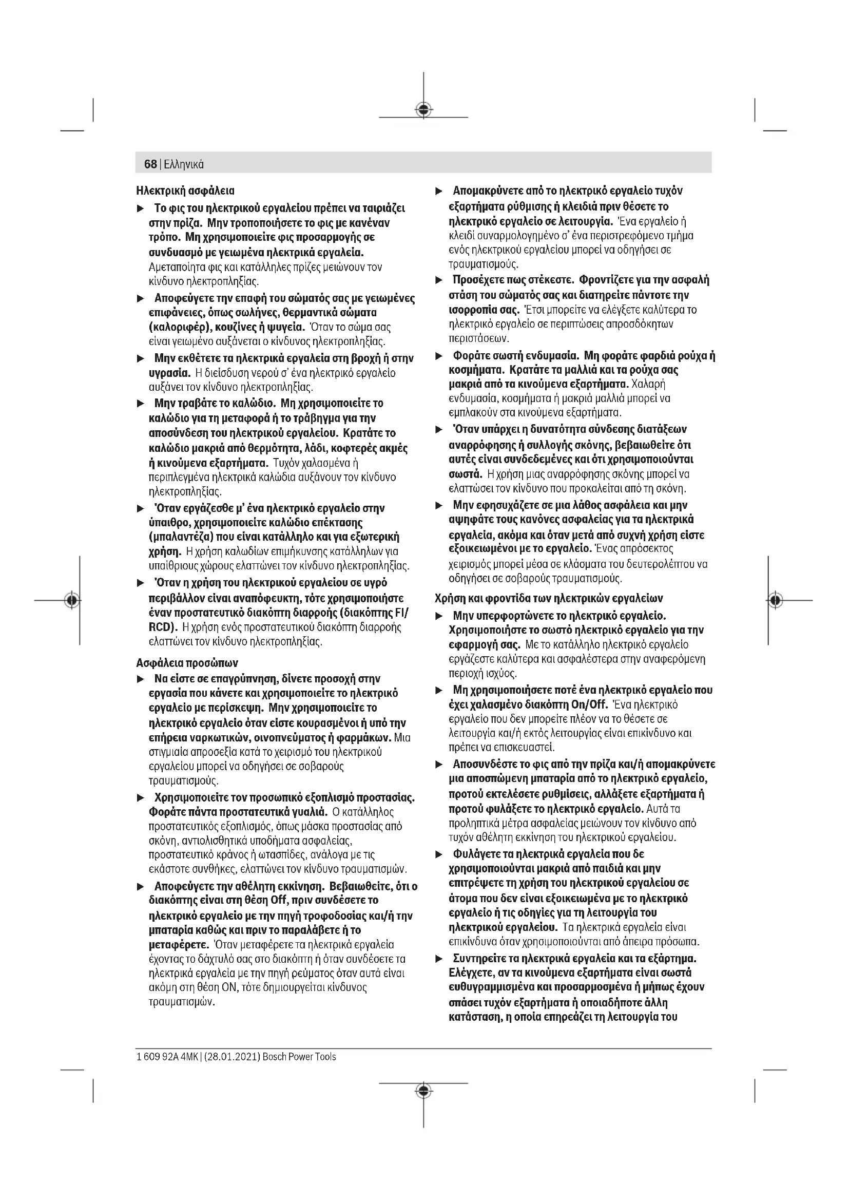 u Μην εργάζεσθε με το ηλεκτρικό εργαλείο σε περιβάλλον, όπου υπάρχει κίνδυνος έκρηξης, όπως με την παρουσία εύφλεκτων υγρών, αερίων ή σκόνης. Τα ηλεκτρικά εργαλεία δημιουργούν σπινθηρισμό ο οποίος μπορεί να αναφλέξει τη σκόνη ή τις αναθυμιάσεις. u Όταν χρησιμοποιείτε το ηλεκτρικό εργαλείο, κρατάτε μακριά τα παιδιά και άλλα τυχόν παρευρισκόμενα άτομα. Σε περίπτωση απόσπασης της προσοχής σας μπορεί να χάσετε τον έλεγχο του εργαλείου. Bosch Power Tools 1 609 92A 4MK | (28.01.2021)68 | Ελληνικά Ηλεκτρική ασφάλεια u Το φις του ηλεκτρικού εργαλείου πρέπει να ταιριάζει στην πρίζα. Μην τροποποιήσετε το φις με κανέναν τρόπο. Μη χρησιμοποιείτε φις προσαρμογής σε συνδυασμό με γειωμένα ηλεκτρικά εργαλεία. Αμεταποίητα φις και κατάλληλες πρίζες μειώνουν τον κίνδυνο ηλεκτροπληξίας. u Αποφεύγετε την επαφή του σώματός σας με γειωμένες επιφάνειες, όπως σωλήνες, θερμαντικά σώματα (καλοριφέρ), κουζίνες ή ψυγεία. Όταν το σώμα σας είναι γειωμένο αυξάνεται ο κίνδυνος ηλεκτροπληξίας. u Μην εκθέτετε τα ηλεκτρικά εργαλεία στη βροχή ή στην υγρασία. Η διείσδυση νερού σ’ ένα ηλεκτρικό εργαλείο αυξάνει τον κίνδυνο ηλεκτροπληξίας. u Μην τραβάτε το καλώδιο. Μη χρησιμοποιείτε το καλώδιο για τη μεταφορά ή το τράβηγμα για την αποσύνδεση του ηλεκτρικού εργαλείου. Κρατάτε το καλώδιο μακριά από θερμότητα, λάδι, κοφτερές ακμές ή κινούμενα εξαρτήματα. Τυχόν χαλασμένα ή περιπλεγμένα ηλεκτρικά καλώδια αυξάνουν τον κίνδυνο ηλεκτροπληξίας. u Όταν εργάζεσθε μ’ ένα ηλεκτρικό εργαλείο στην ύπαιθρο, χρησιμοποιείτε καλώδιο επέκτασης (μπαλαντέζα) που είναι κατάλληλο και για εξωτερική χρήση. Ηχρήση καλωδίων επιμήκυνσης κατάλληλων για υπαίθριους χώρους ελαττώνει τον κίνδυνο ηλεκτροπληξίας. u Όταν η χρήση του ηλεκτρικού εργαλείου σε υγρό περιβάλλον είναι αναπόφευκτη, τότε χρησιμοποιήστε έναν προστατευτικό διακόπτη διαρροής (διακόπτηςFI/ RCD). Ηχρήση ενός προστατευτικού διακόπτη διαρροής ελαττώνει τον κίνδυνο ηλεκτροπληξίας. Ασφάλεια προσώπων u Να είστε σε επαγρύπνηση, δίνετε προσοχή στην εργασία που κάνετε και χρησιμοποιείτε το ηλεκτρικό εργαλείο με περίσκεψη. Μην χρησιμοποιείτε το ηλεκτρικό εργαλείο όταν είστε κουρασμένοι ή υπό την επήρεια ναρκωτικών, οινοπνεύματος ή φαρμάκων. Μια στιγμιαία απροσεξία κατά το χειρισμό του ηλεκτρικού εργαλείου μπορεί να οδηγήσει σε σοβαρούς τραυματισμούς. u Χρησιμοποιείτε τον προσωπικό εξοπλισμό προστασίας. Φοράτε πάντα προστατευτικά γυαλιά. Ο κατάλληλος προστατευτικός εξοπλισμός, όπως μάσκα προστασίας από σκόνη, αντιολισθητικά υποδήματα ασφαλείας, προστατευτικό κράνος ή ωτασπίδες, ανάλογα με τις εκάστοτε συνθήκες, ελαττώνει τον κίνδυνο τραυματισμών. u Αποφεύγετε την αθέλητη εκκίνηση. Βεβαιωθείτε, ότι ο διακόπτης είναι στη θέση Off, πριν συνδέσετε το ηλεκτρικό εργαλείο με την πηγή τροφοδοσίας και/ή την μπαταρία καθώς και πριν το παραλάβετε ή το μεταφέρετε. Όταν μεταφέρετε τα ηλεκτρικά εργαλεία έχοντας το δάχτυλό σας στο διακόπτη ή όταν συνδέσετε τα ηλεκτρικά εργαλεία με την πηγή ρεύματος όταν αυτά είναι ακόμη στη θέση ΟΝ, τότε δημιουργείται κίνδυνος τραυματισμών. u Απομακρύνετε από το ηλεκτρικό εργαλείο τυχόν εξαρτήματα ρύθμισης ή κλειδιά πριν θέσετε το ηλεκτρικό εργαλείο σε λειτουργία. Ένα εργαλείο ή κλειδί συναρμολογημένο σ’ ένα περιστρεφόμενο τμήμα ενός ηλεκτρικού εργαλείου μπορεί να οδηγήσει σε τραυματισμούς. u Προσέχετε πως στέκεστε. Φροντίζετε