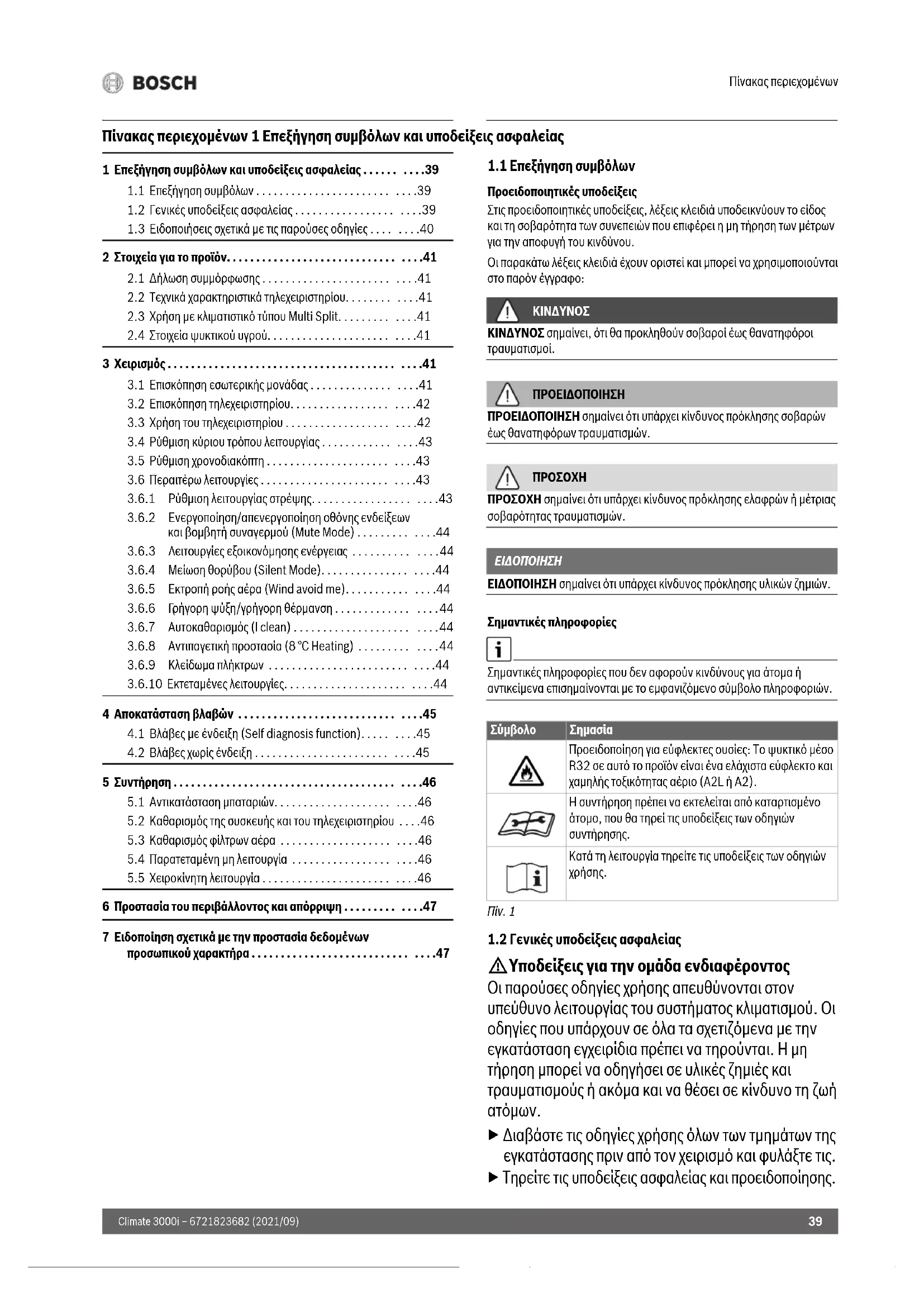 ▶ Διαβάστε τις οδηγίες χρήσης όλων των τμημάτων της εγκατάστασης πριν από τον χειρισμό και φυλάξτε τις. ▶ Τηρείτε τις υποδείξεις ασφαλείας και προειδοποίησης. 1 Επεξήγηση συμβόλων και υποδείξεις ασφαλείας . . . . . . . . . .39