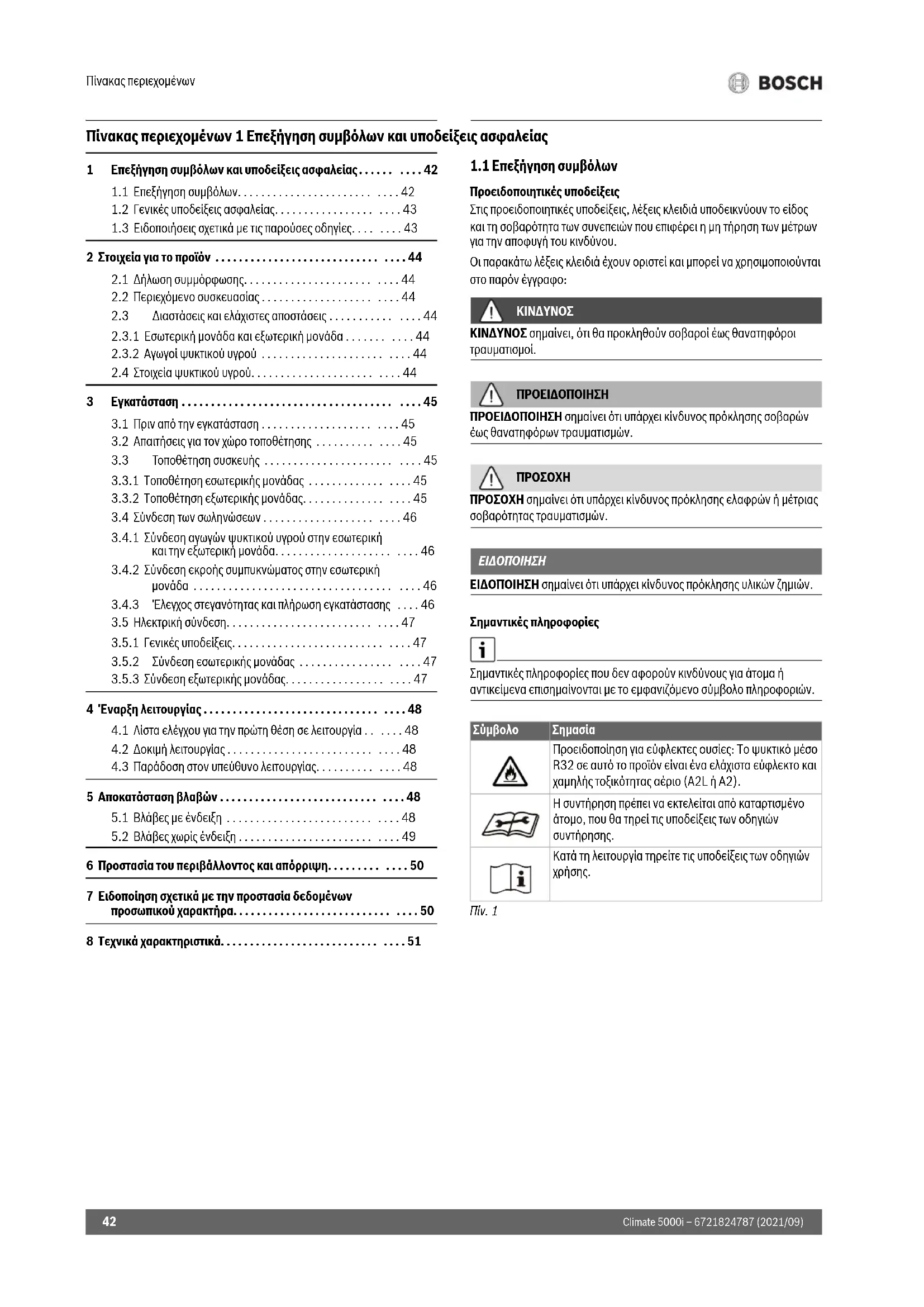 είναι ελάχιστα εύφλεκτο και χαμηλής τοξικότητας (A2L ή A2). Η περιεχόμενη ποσότητα αναγράφεται στην πινακίδα τεχνικών χαρακτηριστικών. Τα ψυκτικά υγρά αποτελούν κίνδυνο για το περιβάλλον και πρέπει να συλλέγονται και να απορρίπτονται ξεχωριστά. 7 Ειδοποίηση σχετικά με την προστασία δεδομένων προσωπικού χαρακτήρα Η εταιρεία Robert Bosch A.E., ΕΡΧΕΙΑΣ 37, Τ.Κ. 19400 ΚΟΡΩΠΙ, Ελλάδα, υποβάλλει σε επεξεργασία τις πληροφορίες προϊόντος και εγκατάστασης, τα τεχνικά δεδομένα και δεδομένα σύνδεσης, τα δεδομένα επικοινωνίας, τα δεδομένα καταχώρισης προϊόντος και του ιστορικού πελατών με σκοπό την παροχή των λειτουργιών του προϊόντος [άρθρο 6 (1) στοιχείο 1 (β) ΓΚΠΔ], για την εκπλήρωση της υποχρέωσης μας να επιτηρούμε το προϊόν και για σκοπούς ασφάλειας του προϊόντος [αρ. 6 (1) στοιχείο 1 (στ) ΓΚΠΔ], τη διαφύλαξη των δικαιωμάτων της εταιρείας μας σε σχέση με τις ερωτήσεις που αφορούν την εγγύηση και την καταχώριση του προϊόντος [άρθρο 6 (1) στοιχείο1 (στ) ΓΚΠΔ] και την ανάλυση των δεδομένων διανομής των προϊόντων μας καθώς και την παροχή εξατομικευμένων πληροφοριών και προσφορών που σχετίζονται με το προϊόν [άρθρο 6 (1) στοιχείο 1 (στ) ΓΚΠΔ]. Αναφορικά με την παροχή υπηρεσιών, όπως είναι οι υπηρεσίες πωλήσεων και μάρκετινγκ, η διαχείριση συμβάσεων, ο διακανονισμός πληρωμών, ο προγραμματισμός, η φιλοξενία δεδομένων και οι υπηρεσίες ανοικτής τηλεφωνικής γραμμής, μπορούμε να τις αναθέτουμε και να μεταβιβάζουμε δεδομένα σε εξωτερικούς παρόχους υπηρεσιών ή/και θυγατρικές επιχειρήσεις της Bosch. Σε ορισμένες περιπτώσεις, μόνο εφόσον διασφαλίζεται η προσήκουσα προστασία δεδομένων, τα προσωπικά δεδομένα ενδέχεται να μεταβιβάζονται σε αποδέκτες με έδρα εκτός του Ευρωπαϊκού Οικονομικού Χώρου. Περισσότερες πληροφορίες παρέχονται κατόπιν σχετικού αιτήματος. Μπορείτε να επικοινωνήσετε με τον υπεύθυνο προστασίας δεδομένων της εταιρείας μας στην εξής διεύθυνση: Data Protection Officer, Information Security and Privacy (C/ ISP), Robert Bosch GmbH, Postfach 30 02 20, 70442 Stuttgart,