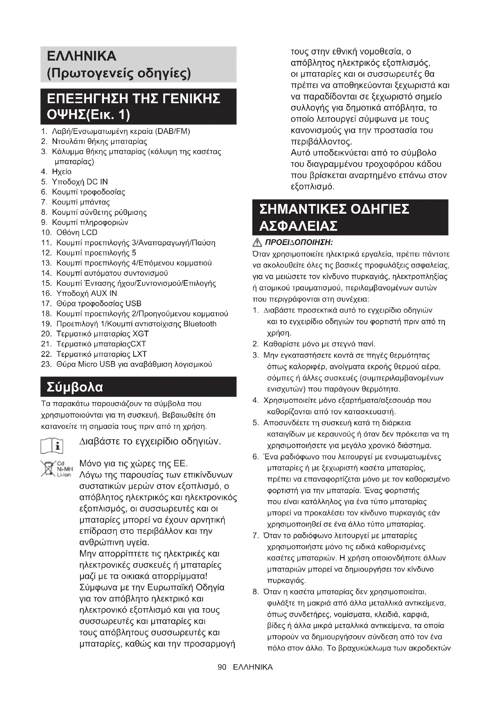 Τα παρακάτω παρουσιάζουν τα σύμβολα που χρησιμοποιούνται για τη συσκευή. Βεβαιωθείτε ότι κατανοείτε τη σημασία τους πριν από τη χρήση. ∆ιαβάστε το εγχειρίδιο οδηγιών. Μόνο για τις χώρες της ΕΕ. Λόγω της παρουσίας των επικίνδυνων συστατικών μερών στον εξοπλισμό, ο απόβλητος ηλεκτρικός και ηλεκτρονικός εξοπλισμός, οι συσσωρευτές και οι μπαταρίες μπορεί να έχουν αρνητική επίδραση στο περιβάλλον και την ανθρώπινη υγεία. Μην απορρίπτετε τις ηλεκτρικές και ηλεκτρονικές συσκευές ή μπαταρίες μαζί με τα οικιακά απορρίμματα! Σύμφωνα με την Ευρωπαϊκή Οδηγία για τον απόβλητο ηλεκτρικό και ηλεκτρονικό εξοπλισμό και για τους συσσωρευτές και μπαταρίες και τους απόβλητους συσσωρευτές και μπαταρίες, καθώς και την προσαρμογή τους στην εθνική νομοθεσία, ο απόβλητος ηλεκτρικός εξοπλισμός, οι μπαταρίες και οι συσσωρευτές θα πρέπει να αποθηκεύονται ξεχωριστά και να παραδίδονται σε ξεχωριστό σημείο συλλογής για δημοτικά απόβλητα, το οποίο λειτουργεί σύμφωνα με τους κανονισμούς για την προστασία του περιβάλλοντος. Αυτό υποδεικνύεται από το σύμβολο του διαγραμμένου τροχοφόρου κάδου που βρίσκεται αναρτημένο επάνω στον
